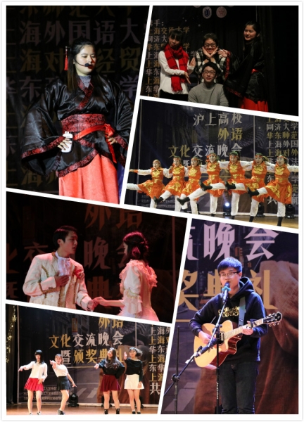 晚会上,华东师范大学学生演唱的歌曲《远方的额吉》以及舞蹈表演《时代节奏》充满浓浓的蒙古族风情;华东政法大学学生带来的日语歌曲《Butterfly》勾起众人的童年回忆;上海对外经贸大学的英文短剧《歌剧魅影》让人重温经典;外文歌曲大赛二等奖得主演唱的英语歌曲《Last Christmas》和上海师范大学的B-box表演将全场的气氛带上了又一个高潮;传统的《孔雀东南飞》配上英文的对白让人深感东西方文化交融的力量;华理学生的一曲安静的吉他弹唱《南方姑娘》引得思绪万千;华理生工学院“鹦鹉螺”舞蹈队、外语学院艺术团的舞蹈《Tik Tok》活力四射;外文歌曲大赛的冠军组合以一曲《Just one last dance》为晚会画上圆满的句号。