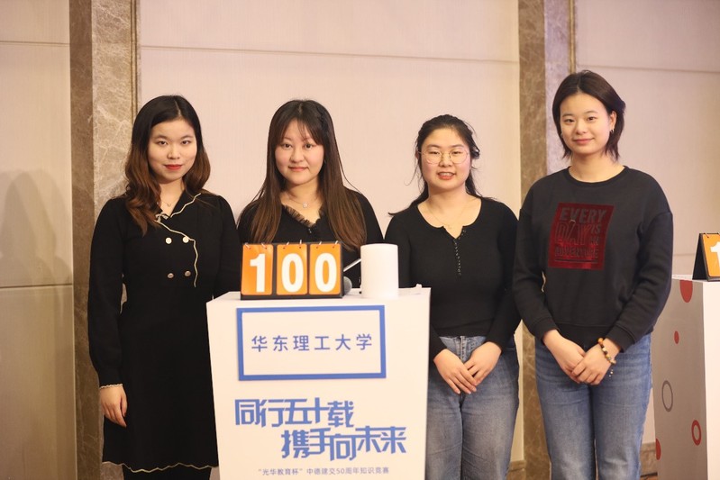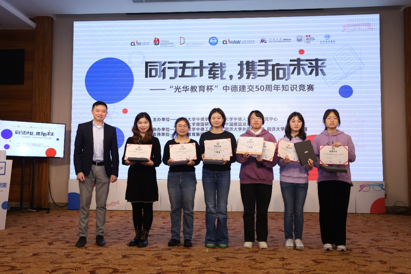 首届“光华教育杯”中德建交50周年知识竞赛于12月3日在同济大学举行。永利官网德语系刘骞、陆一佳和蒋溯三位同学在指导老师次晓芳的带领下,代表华东理工大学参赛。来自同济大学、复旦大学、华东师范大学、上海外国语大学、上海理工大学及永利官网的六所高校的选手参加了此次竞赛。永利官网选手沉着应战,表现出色,经过六轮激烈角逐,最终以优异的成绩荣获团体二等奖。