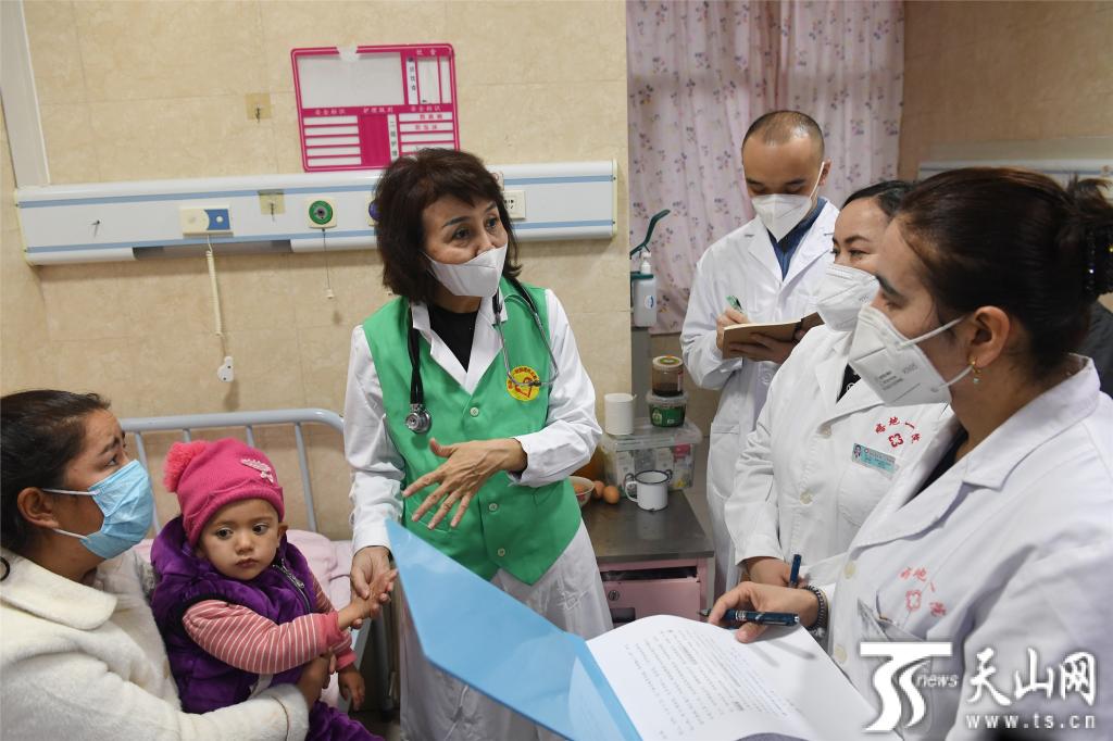 1月24日,米热古丽·买买提在喀什地区第一人民医院儿科病房给小患者进行了检查,并和医护人员分享了自己的诊疗经验。