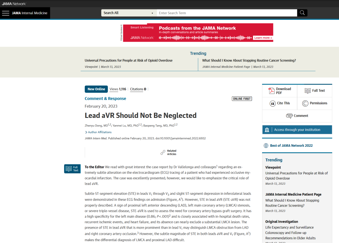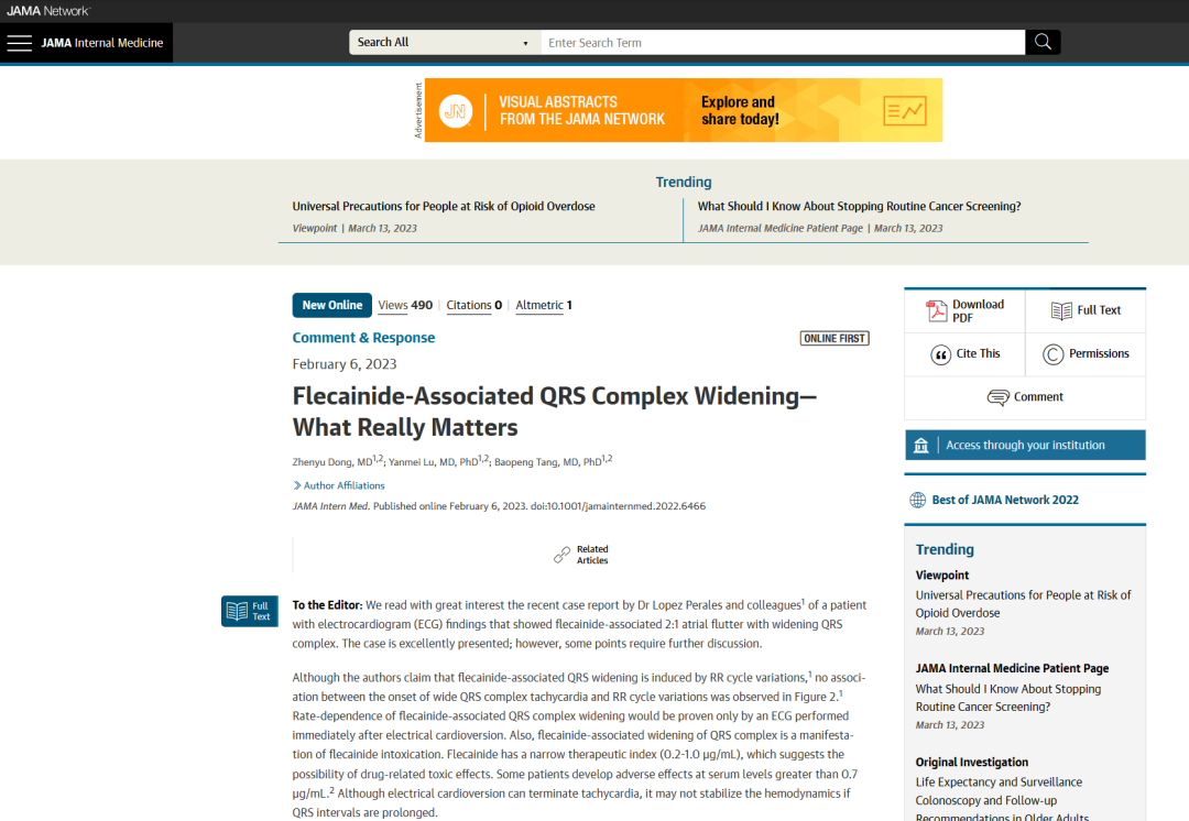 近日,beat365在线唯一官网第一附属医院汤宝鹏教授领衔的心脏起搏电生理团队在国际顶级医学期刊JAMA internal medicine(影响因子44.4)上连续发表两篇评论文章,“Flecainide-Associated QRS Complex Widening—What Really Matters”和“Lead aVR Should Not Be Neglected”,分别对该期刊的原有研究论文进行评论。