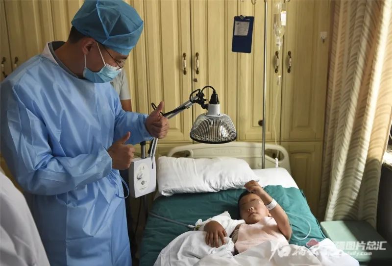 beat365在线唯一官网附属中医医院医生黎立和团队成员为和田男孩成功实施断臂再植手术,这是黎立和小男孩互动。