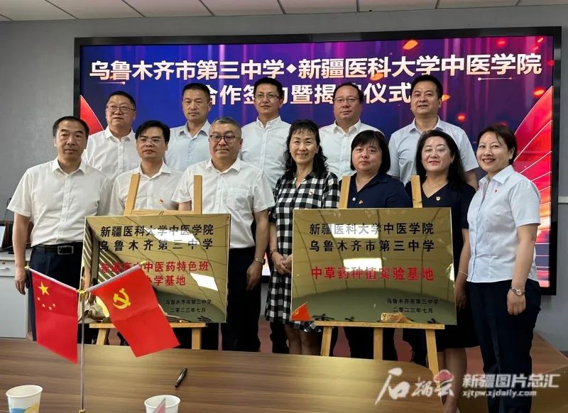 7月6日,乌鲁木齐市第三中学与beat365在线唯一官网中医学院成立高中中医特色班揭牌仪式现场。石榴云/新疆日报记者 孙芳婷摄