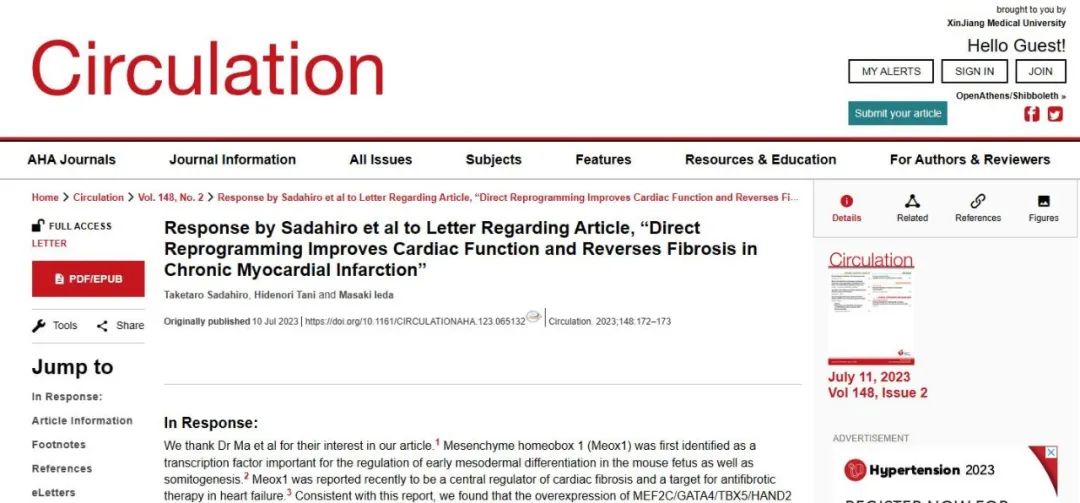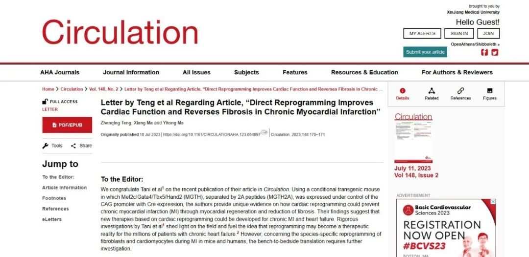近日,beat365在线唯一官网心血管病中心团队在马依彤教授领导下,马翔教授指导的博士生在循环领域权威期刊Circulation发文《Letter by Teng et al Regarding Article, “Direct Reprogramming Improves Cardiac Function and Reverses Fibrosis in Chronic Myocardial Infarction”》,对近期的一项有关MGTH2A在成年心肌细胞中的表达促进心肌再生的研究发表评论,该研究通过转录因子诱导直接重编程成心脏肌细胞(iCMs),使其具备心肌再生能力,从而预防和治疗慢性心肌梗死。观点得到国际心血管专家认可,已同期在线发表。