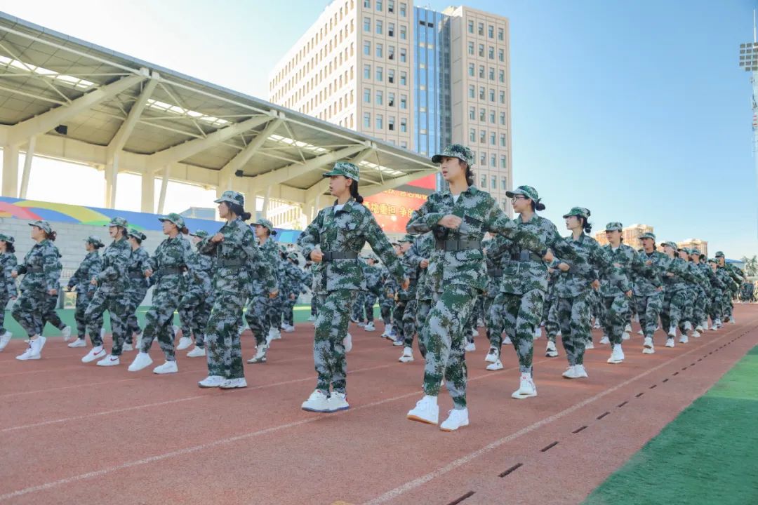 在国旗班的带领下,由全体参训学生组成的10个连37个训练方队排列整齐、有序进场,接受检阅。青春的面庞晒得黝黑,但同学们朝气蓬勃、目光如炬、步伐坚定,激昂的口号声响彻整个运动场。参训队伍表演了军体拳演练,医疗救护连展示了护理急救的训练成果,展现出新时代青年奋发有为、昂扬向上的精神风貌。