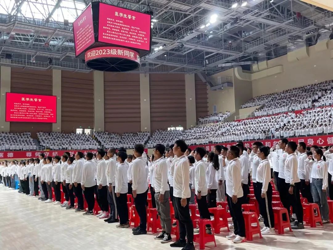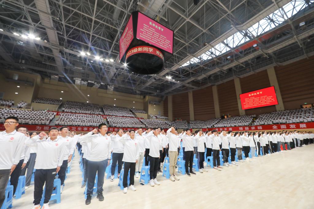beat365在线唯一官网全体新生在副校长刘涛教授的领誓下,共同宣誓《中华人民共和国医学生誓言》。全场齐声发出了“为祖国医药卫生事业的发展和人类身心健康奋斗终生”的铮铮誓言。