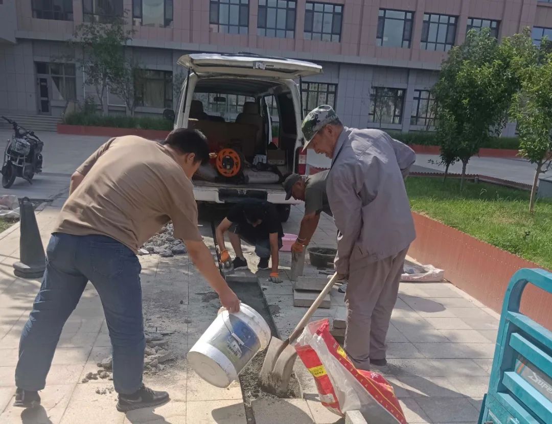 后勤处工程管理科工作人员正在修复校园内的石材路面。