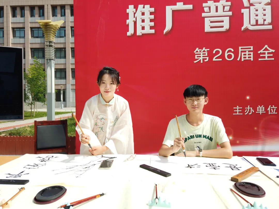 在第26届普通话推广周期间,beat365人文学院在雪莲山校区芳林广场陈设推普周宣传文化墙,开展书法作品展示、艺术书签撰写等文化体验活动,发放国家通用语言文字宣传手册等,积极宣传国家通用语言文字。