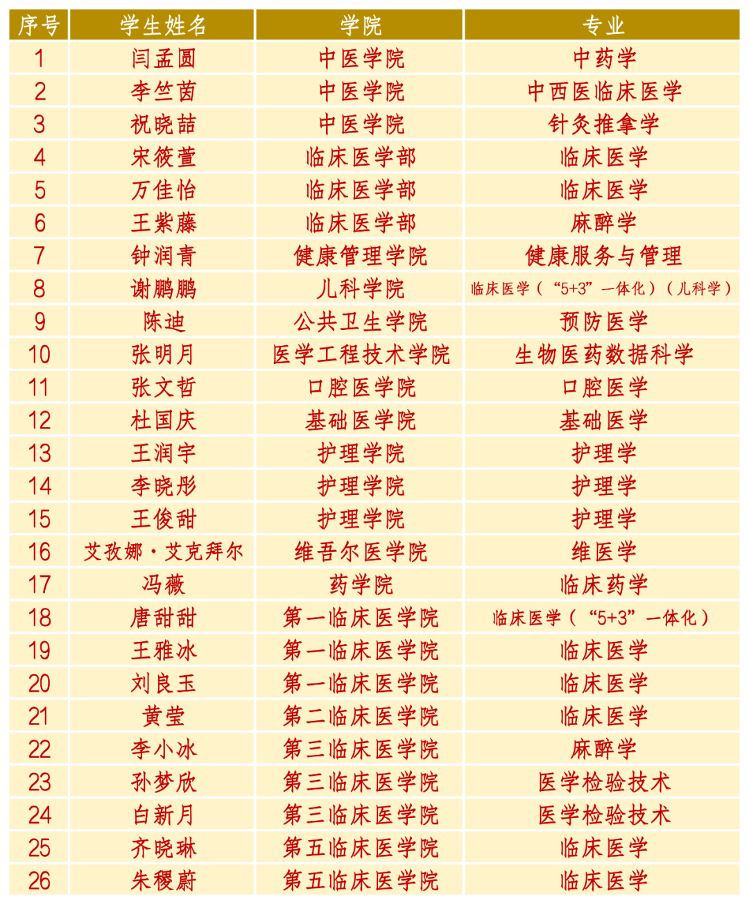 共青团员,第五临床医学院临床医学2020-16班,平均学科绩点4.24曾获国家奖学金,优秀大学生,校级优秀学生奖学金,外研社写作大赛新疆赛区二等奖及校赛特等奖,“词达人杯”新疆赛区特等奖,第九届基础实验设计论坛全国总决赛铜奖及西部赛区二等奖,校实验设计大赛一等奖。17期大创负责人,负责国家课题2项,发表科研论文2篇。