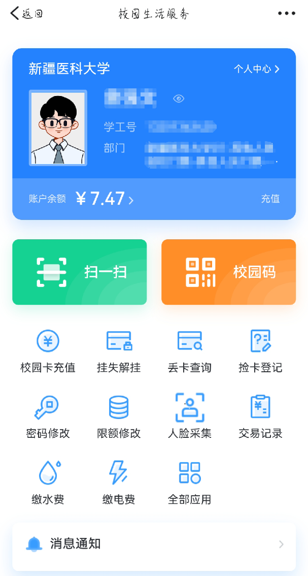 打开 “智慧新医”APP进入“一卡通服务”,动动手指即可轻松办理挂失、解挂、修改密码及修改消费限额;实现线上缴水费、电费。新增遗失卡登记查询服务,在线即可查询校园卡遗失信息;在线自助购水购电,轻松“掌上办”。