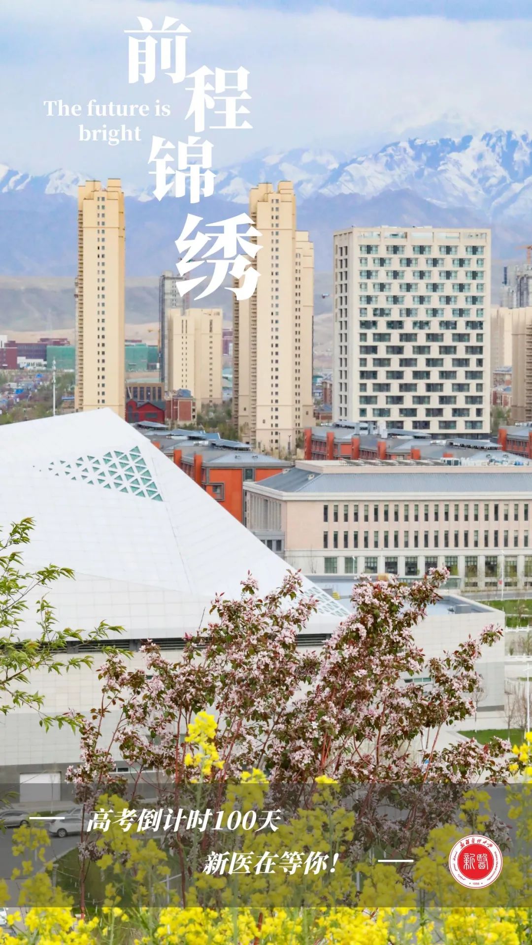致为高考而奋斗的你:此刻我正坐在规培楼的教室里,认真地写下这份鼓励与祝福。新疆的冬天很冷,可回想起几年前与如今的你一样奋力拼搏的我,总是难以平复心中的炙热。距高考百日之际,我想将陪伴我走过高三的话语赠予你。“但是太阳,他每时每刻都是夕阳也都是旭日。当他熄灭着走下山去收尽苍凉残照之际,正是他在另一面燃烧着爬上山巅布散烈烈朝晖之时。”高三后期,成绩波动总令人焦虑不安。每当我想起史铁生写下的这句话,便会觉得一切都充满希望。距离高考还有100天,此刻,无论你在哪里,希望你坚定目标,用好每一天,把握每一分,珍惜每一秒。加油!我们在新医大等你!