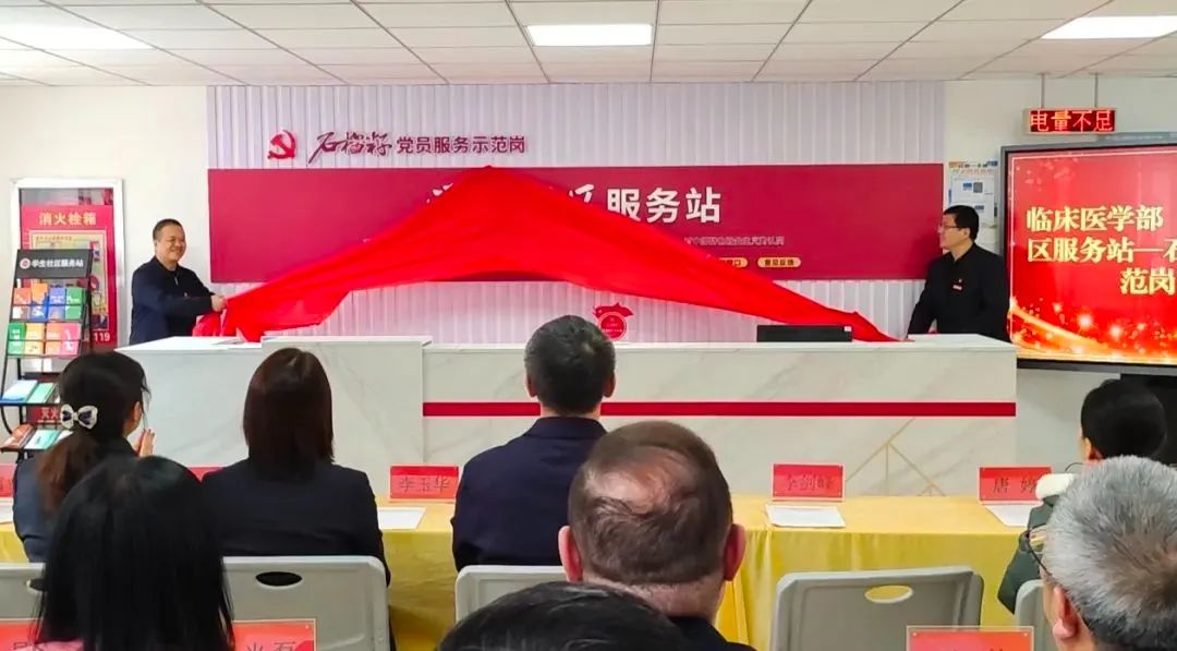 近日,临床医学部“一站式”学生社区服务站举行党员服务示范岗启动仪式,校党委副书记李剑峰为“石榴籽党员服务示范岗”揭牌。