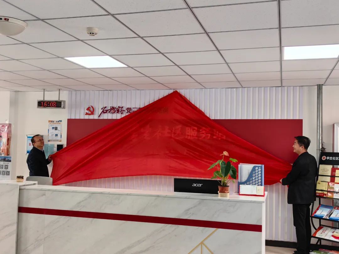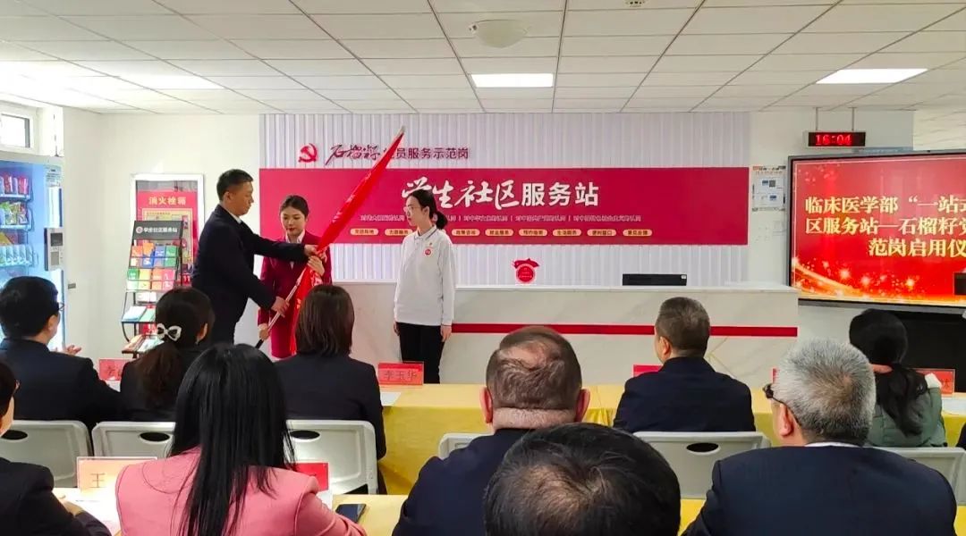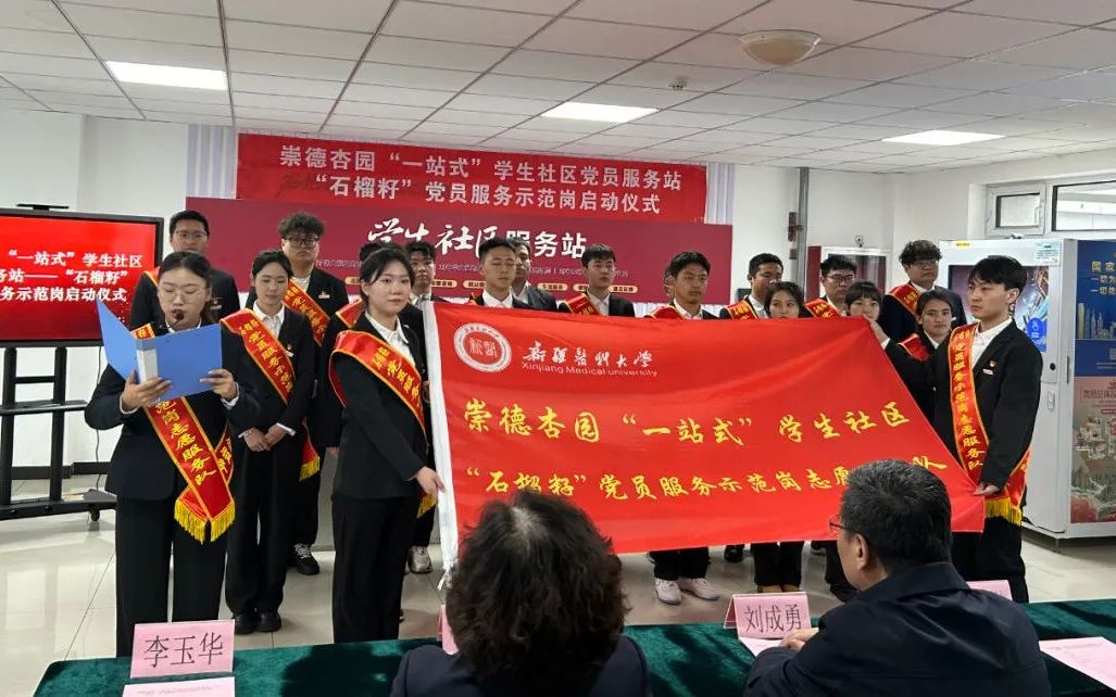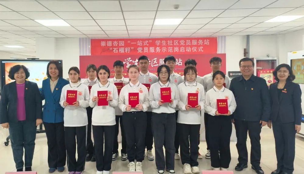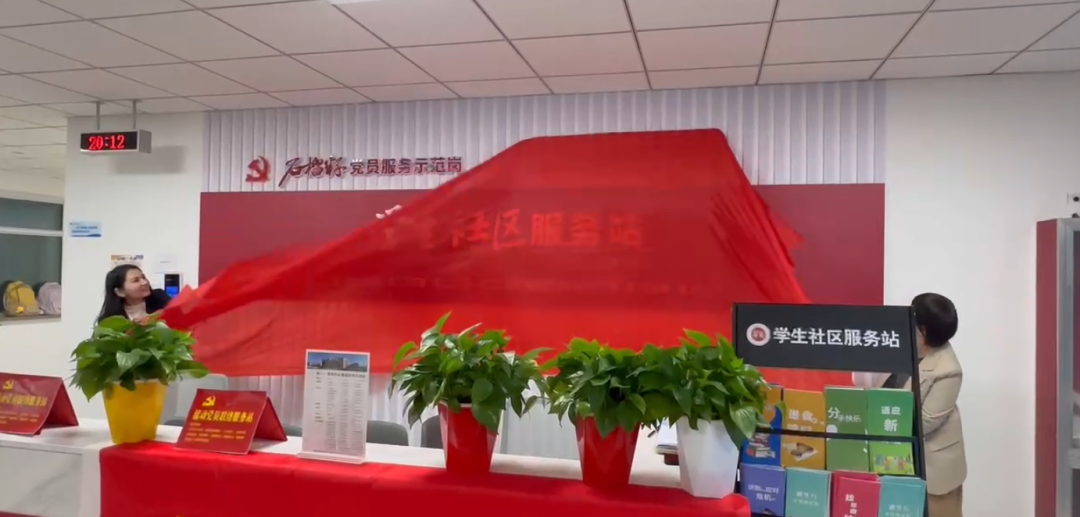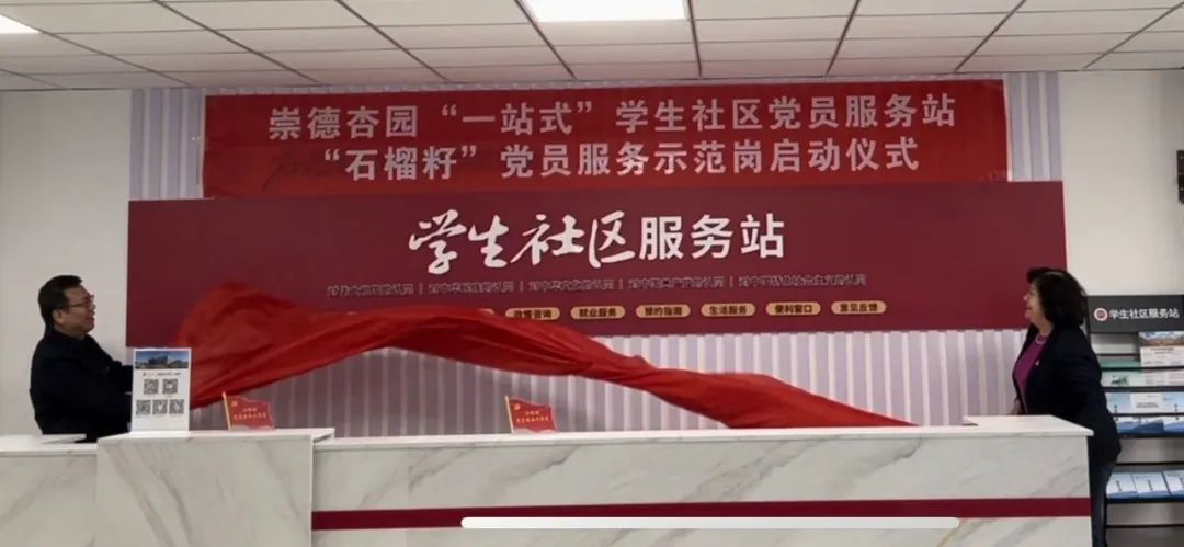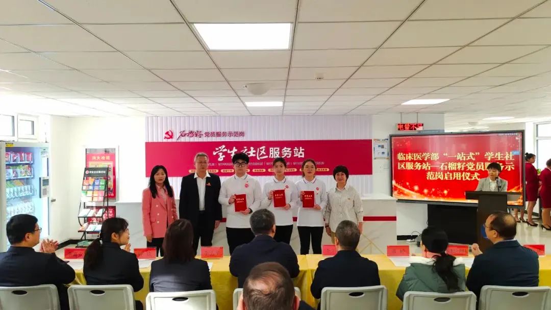 在崇德杏园“一站式”学生社区党员服务站启动仪式上,全科医学学院与医学工程学院共同为“石榴籽党员服务示范岗”揭牌,希望学生党员带动身边的同学全面参与到社区建设中来,更好贡献“党员力量”。