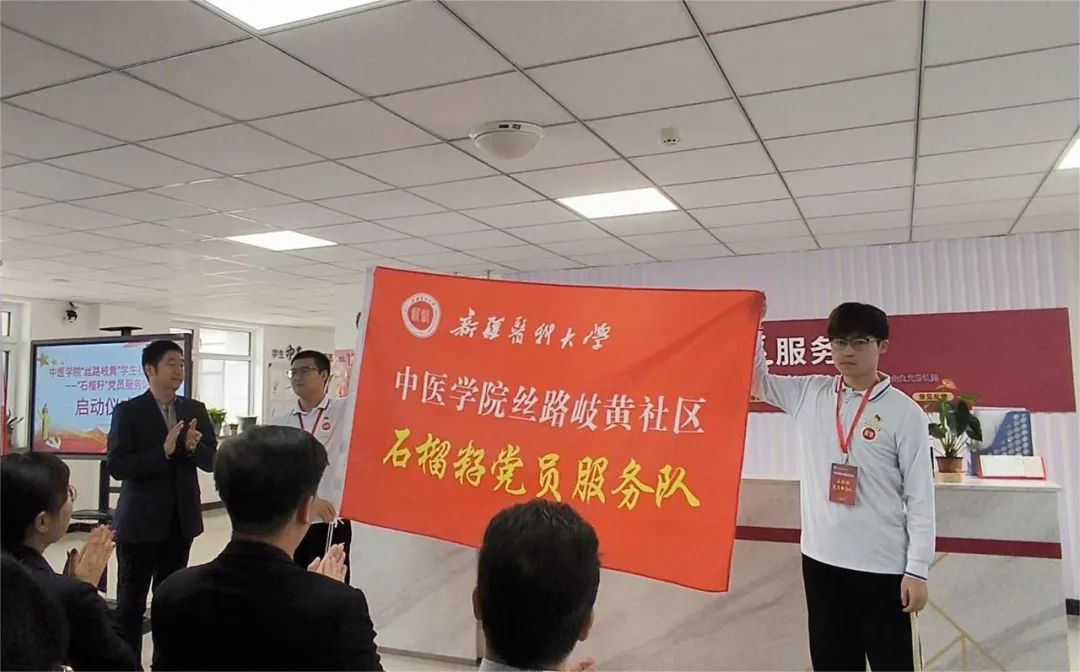 校党委常委、组织部部长祁永福为“石榴籽党员服务队”授旗。石榴籽党员服务示范岗队员代表,医学检验技术2023-3班学生张珂说到,“作为学生党员,我将做好学生社区的领航员、信息员、服务员,积极践行‘我是党员我带头’的誓言,全心全意为同学服务!”