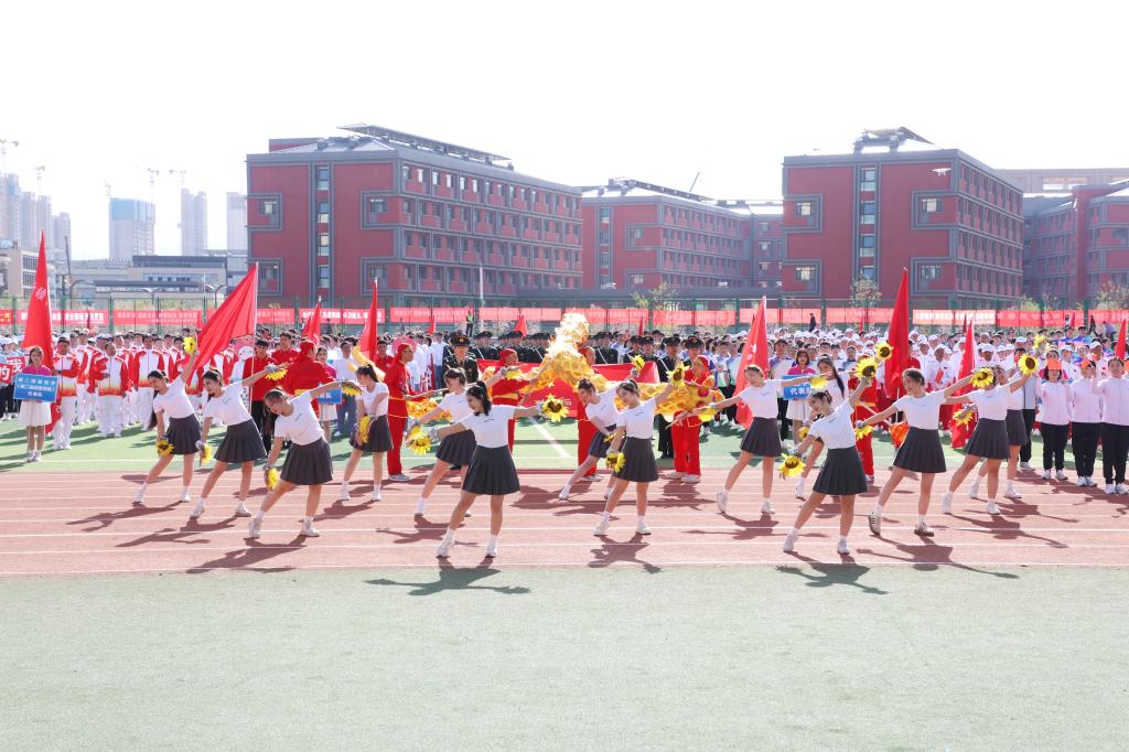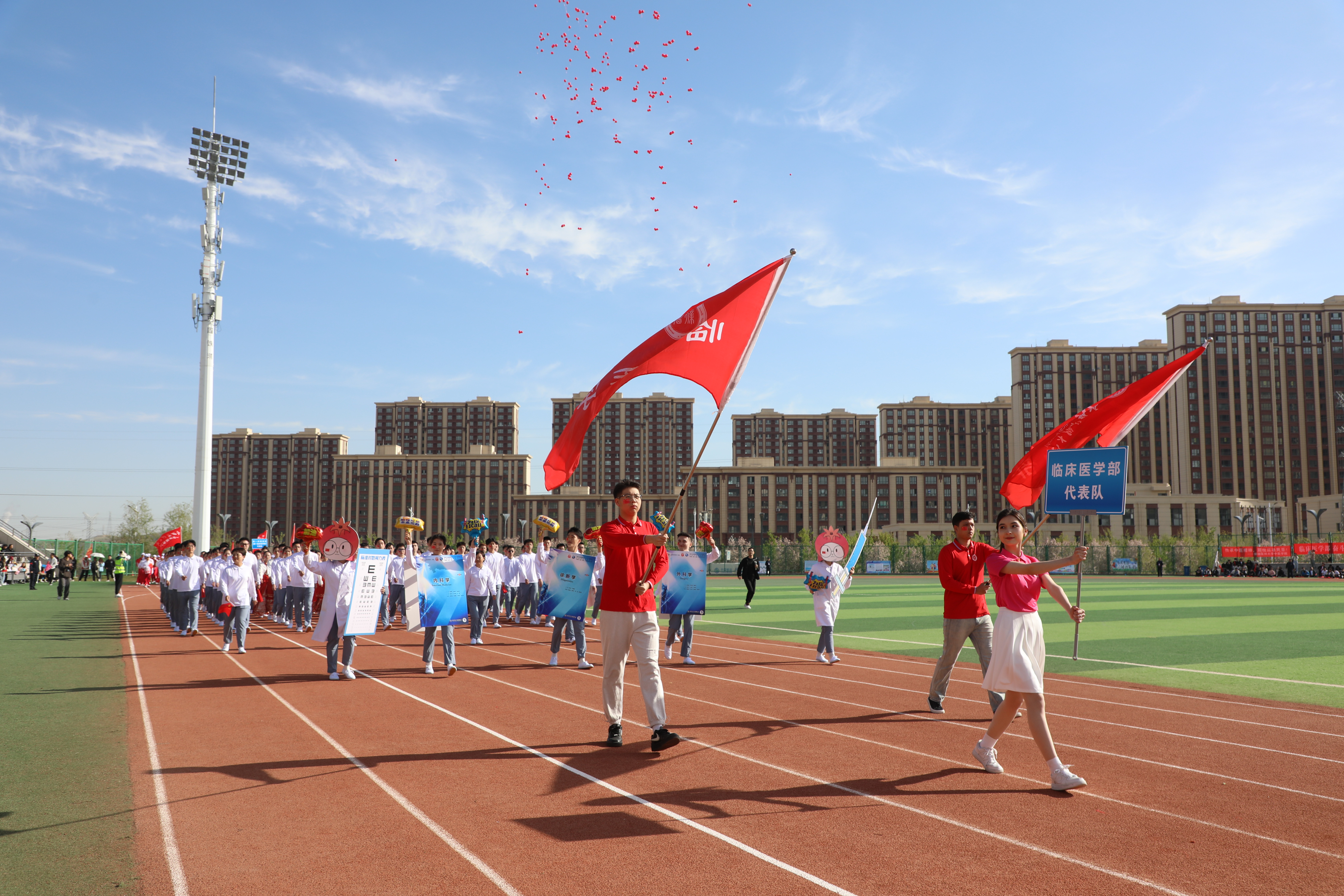 由60名学生代表组成的红旗方阵如似火的年华如胜利的凯歌象征着新时代青年昂扬奋进的精神面貌走出新时代新医人的青春与活力