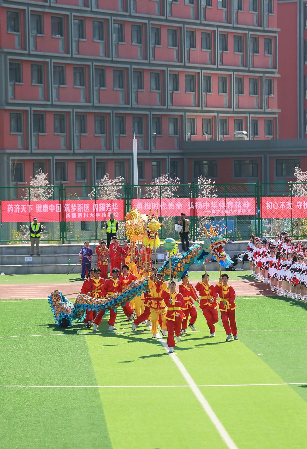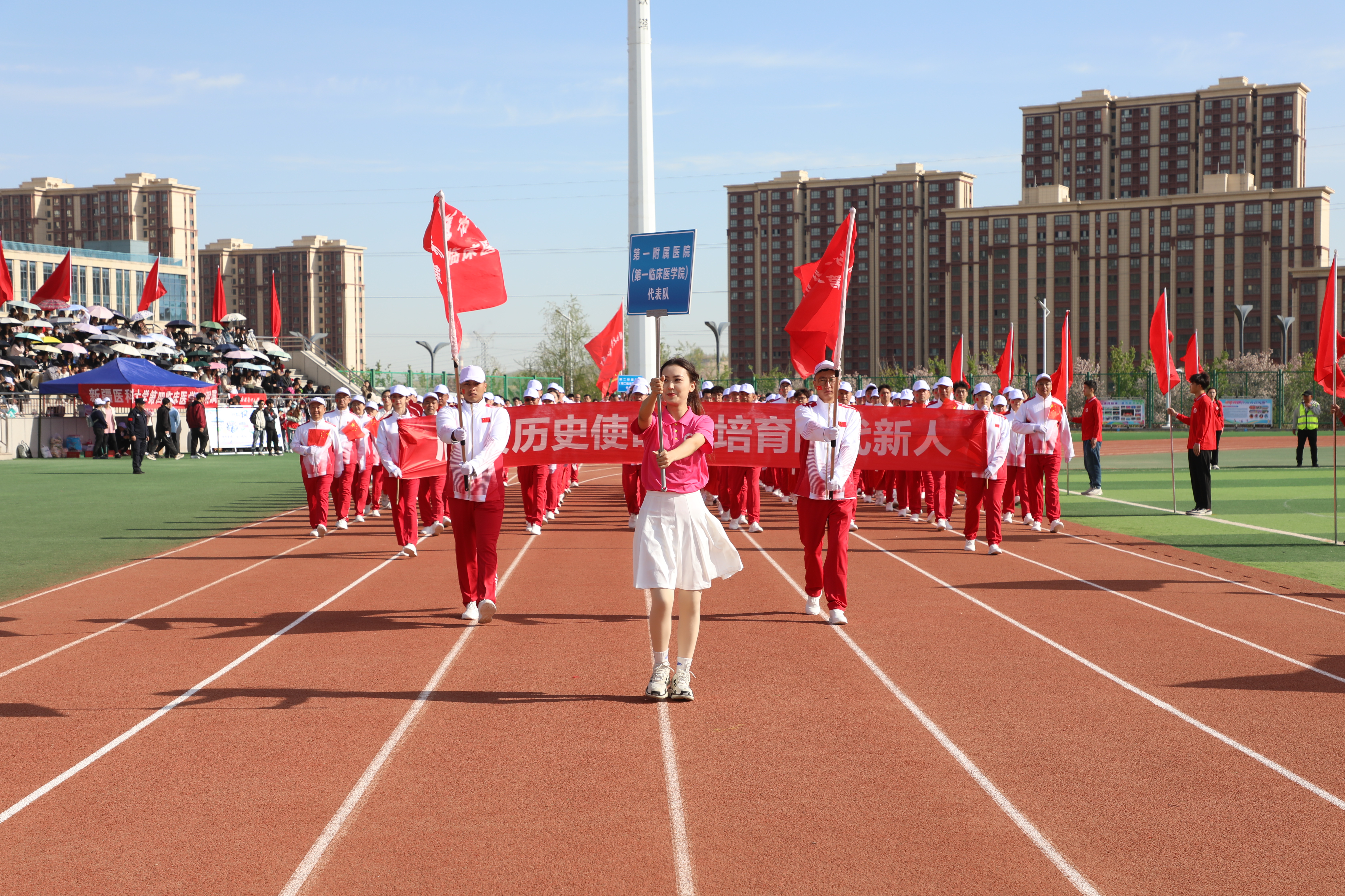 在充满创意的入场式中24个教师和学生运动员方队英姿飒爽、激情澎湃他们昂首阔步走过主席台用整齐的步伐和嘹亮的口号展示着蓬勃向上的新医风采奏响了铿锵豪迈的新医乐章向奋战在教学科研临床一线的全体教职员工致敬为青春朝气的新医学子点赞!