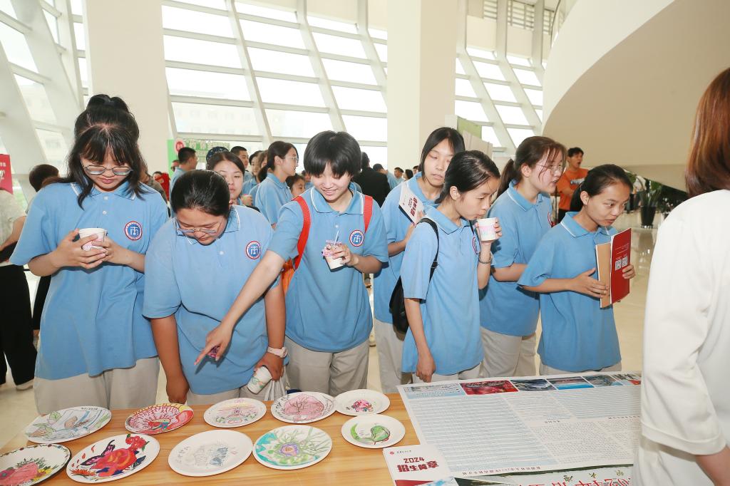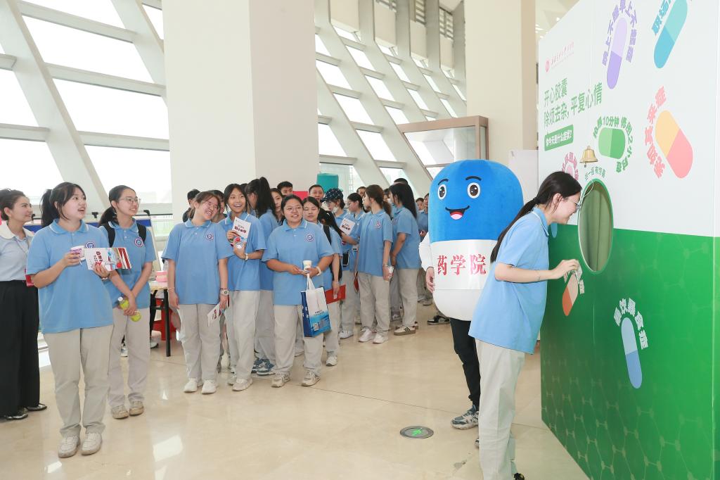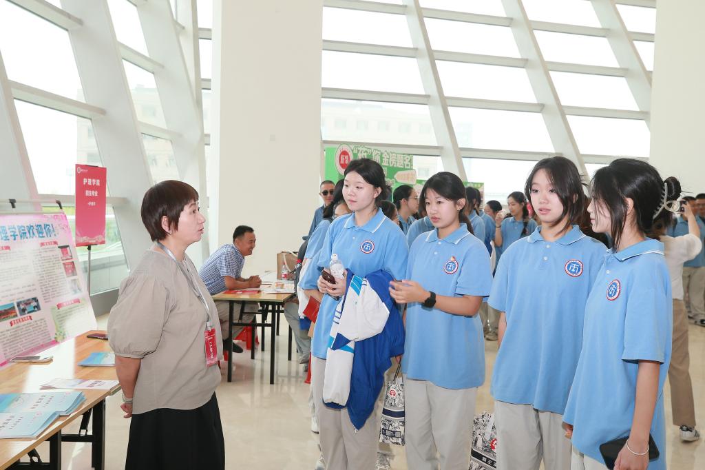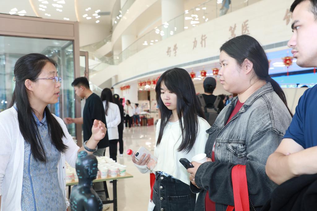 在文创中心大厅内,各学院搭建了内容丰富、形式多样的咨询展台,展示各自的专业特色和优势,用生动形象的学生作品、寓教于乐的互动环节,激发同学们对医学的浓厚兴趣,老师在现场耐心地解答学生和家长关心的问题,在答疑解惑中,拉进同学们与医学专业的距离。