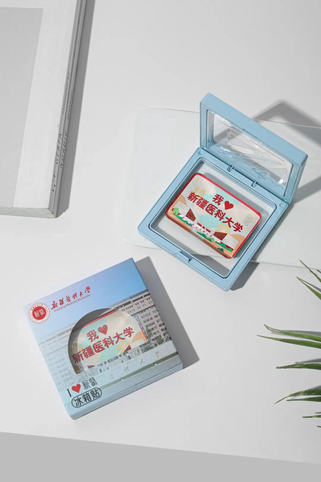 以校园建筑和校徽为原型