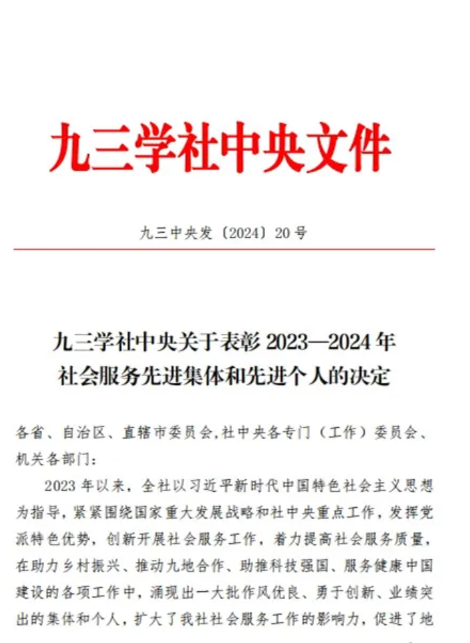 10月9日,九三学社中央下发《九三学社中央关于表彰九三学社组织工作先进集体和先进个人的决定》(九三中央发〔2024〕20 号),九三学社beat365在线唯一官网支社被授予“2023—2024年社会服务先进集体”荣誉称号!