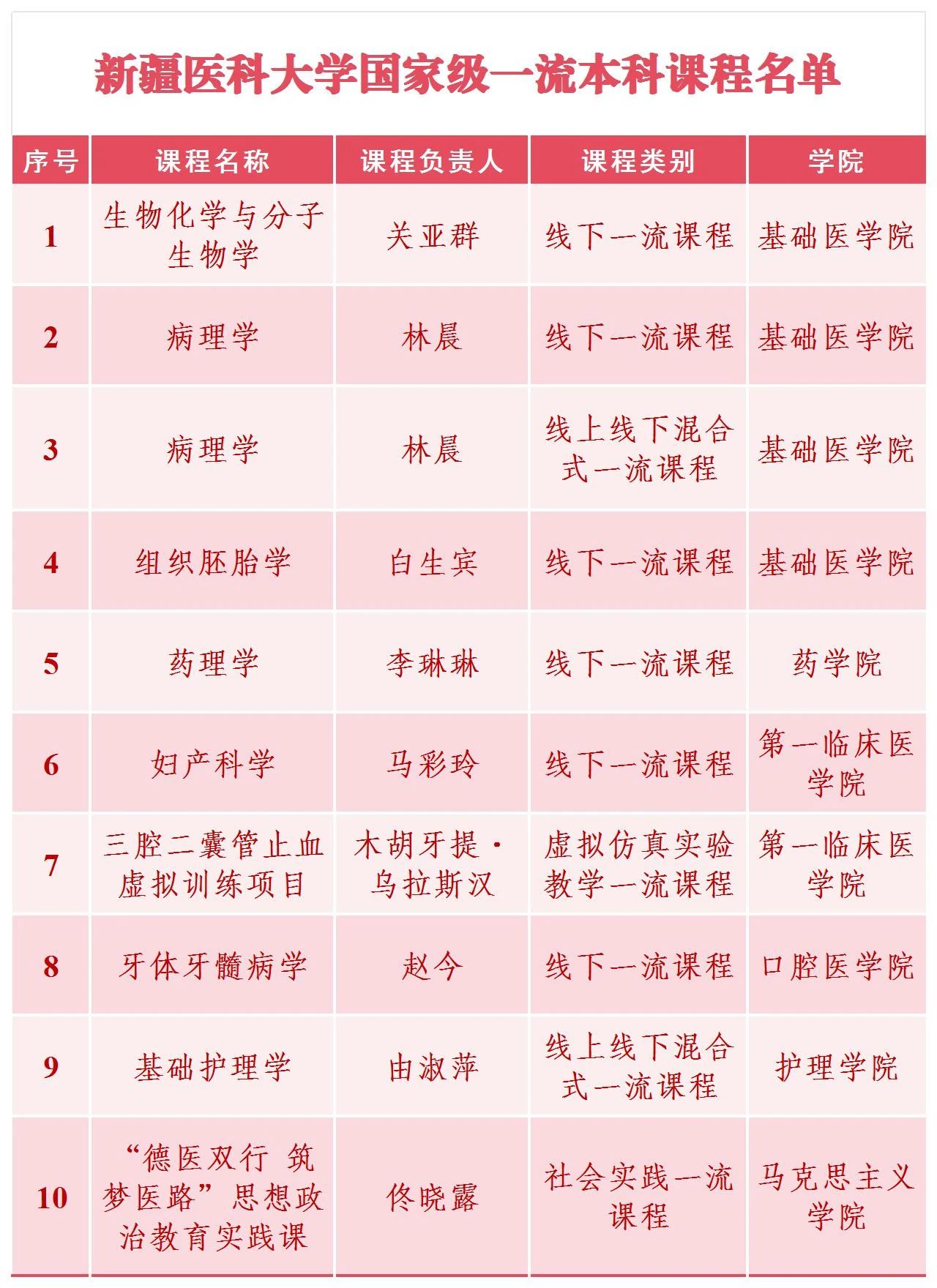 beat365“病理学”课程于2020年获批国家级首批线下“一流本科课程”,2021年获批新疆首批课程思政示范团队。经过三年的建设,目前已建有病理学课程思政案例库、基本契合执业医师大纲的案例库、题库,以及融合思政的病理学教案。