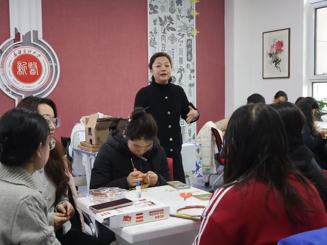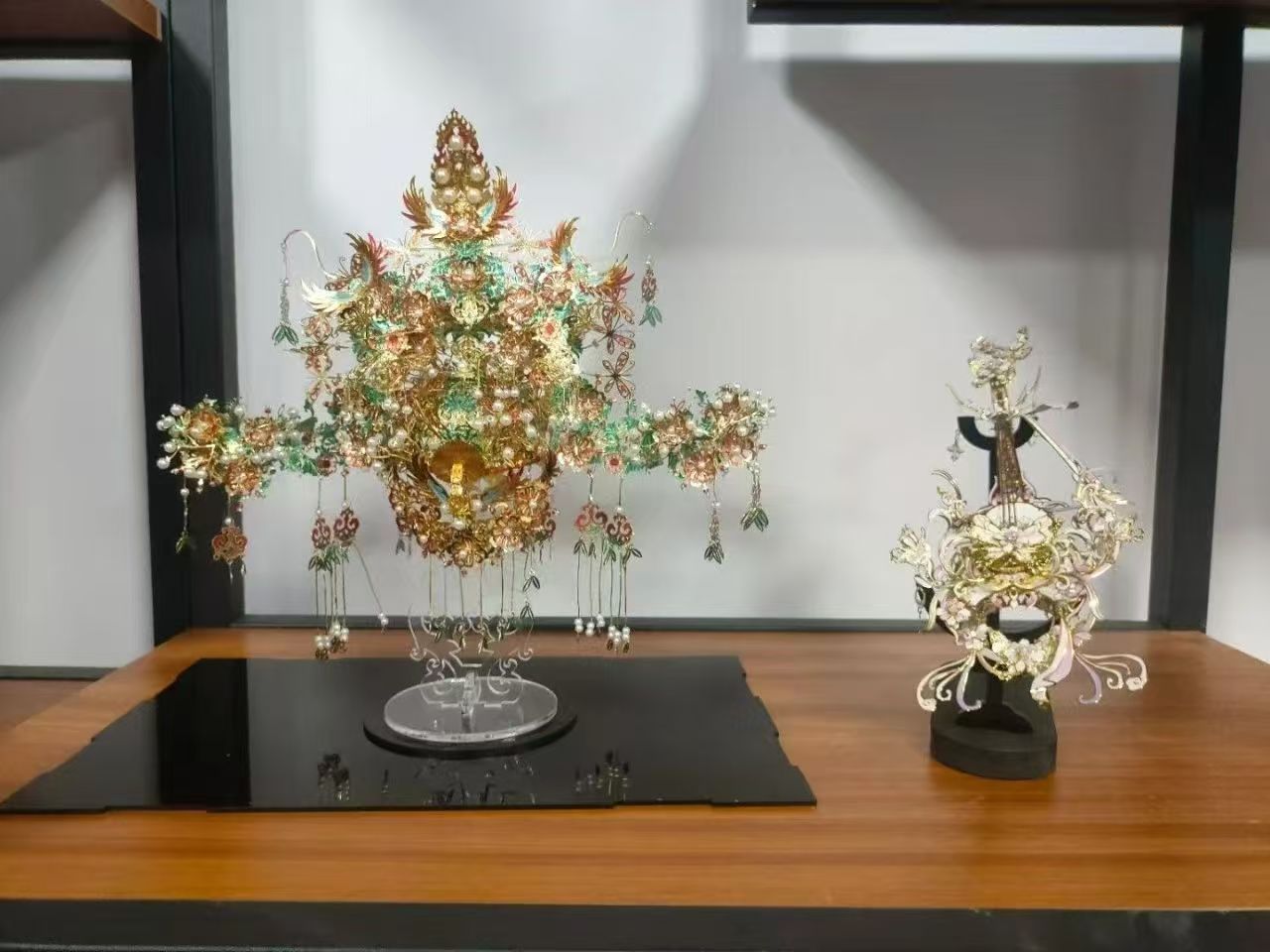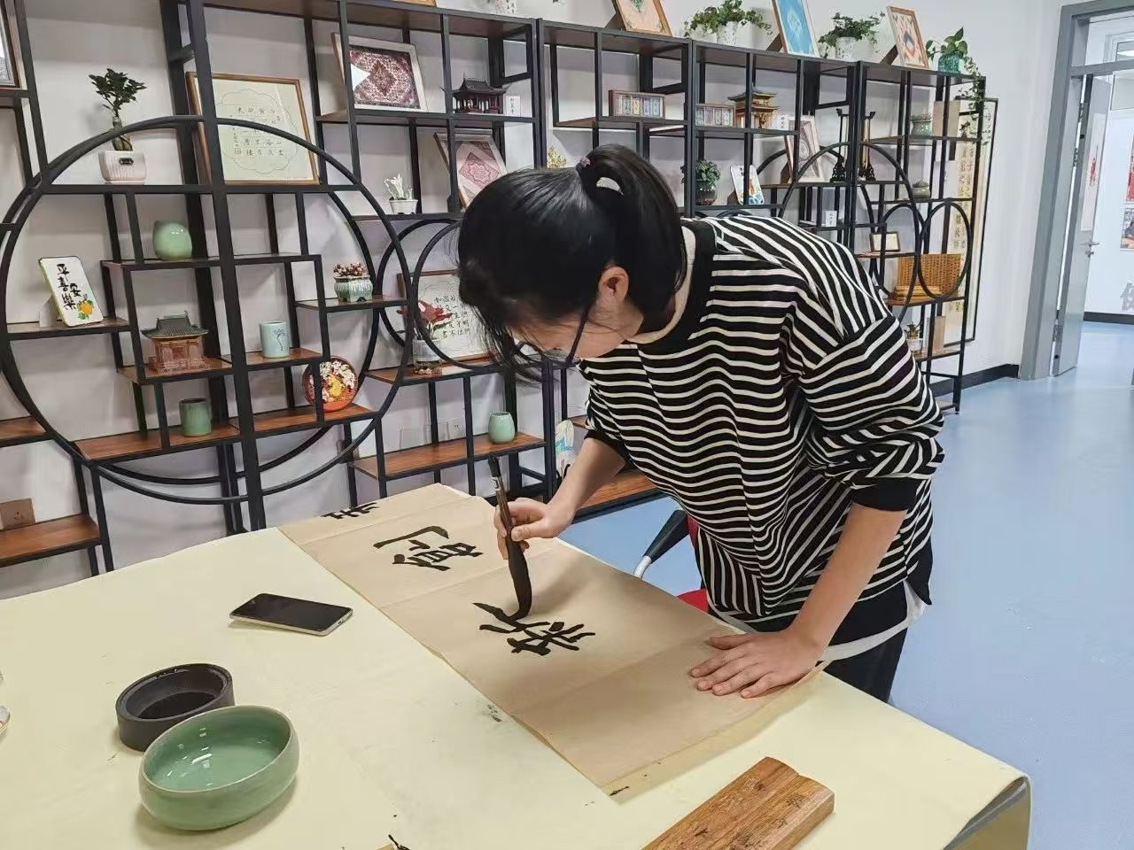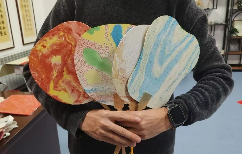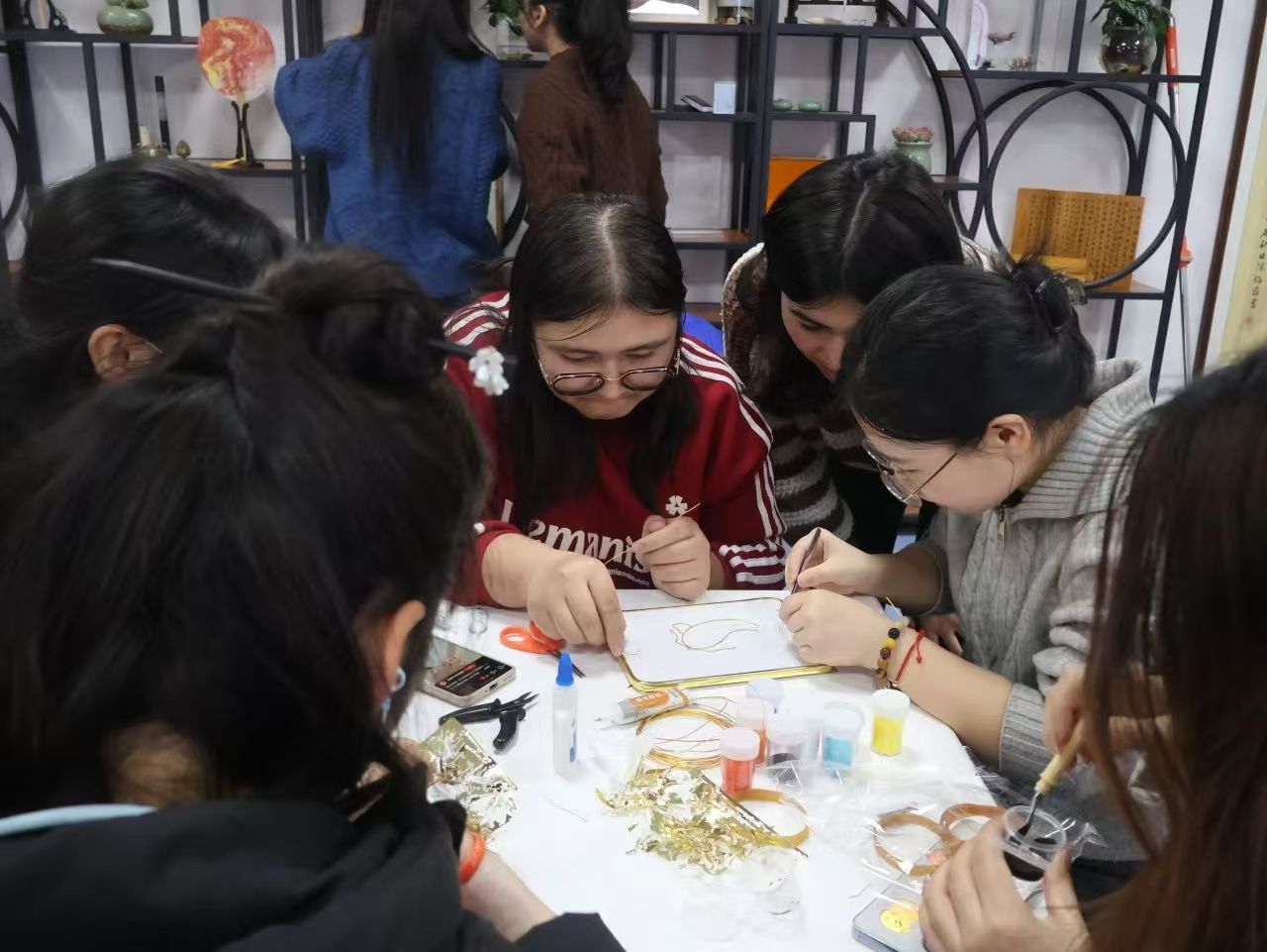 走进教室,目光便被博古架上琳琅满目的展品所吸引。这其中绝大多作品来自学生原创,精美的掐丝珐琅、典雅的漆扇、飘逸的书法作品、独特的鸟冠、剪纸艺术作品……这里不仅是中华文化传承地,更是语言艺术的殿堂,为广大校师生带来优质的文化体验和艺术享受。