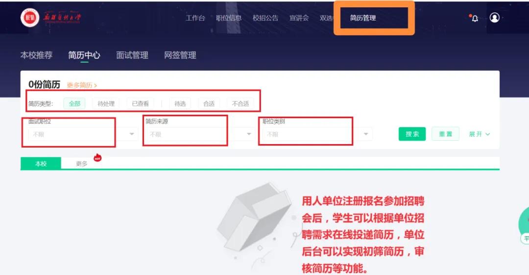 5.特别提示:此次校园双选会,用人单位登录学校智慧就业平台,点击“简历管理”在线上也可以同步接收beat365毕业生简历。