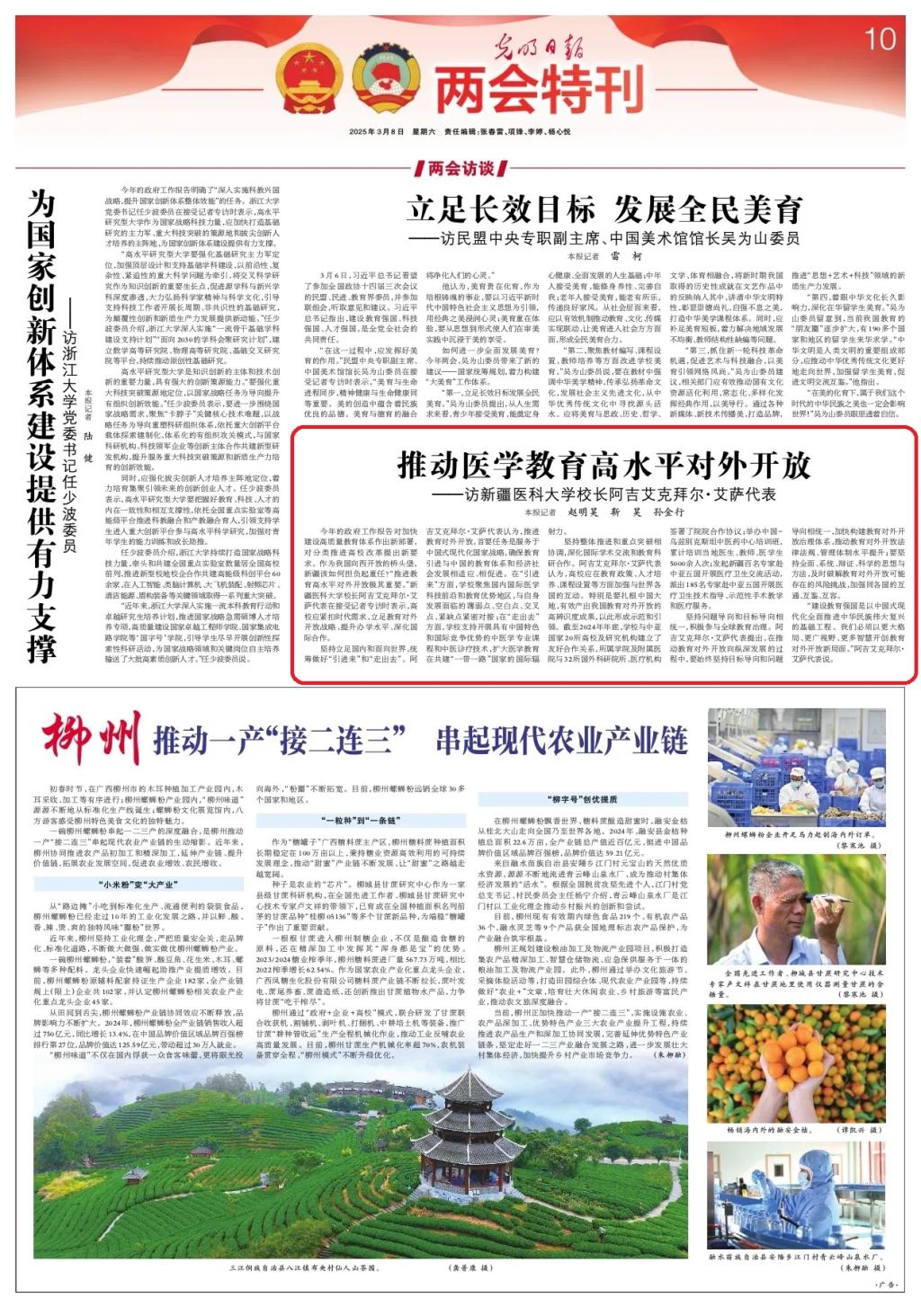 坚持立足国内和面向世界,统筹做好“引进来”和“走出去”。阿吉艾克拜尔·艾萨代表认为,推进教育对外开放,首要任务是服务于中国式现代化国家战略,确保教育引进与中国的教育体系和经济社会发展相适应、相促进。在“引进来”方面,学校聚焦国内国际医学科技前沿和教育优势地区,与自身发展面临的薄弱点、空白点、交叉点、紧缺点紧密对接;在“走出去”方面,学校支持开展具有中国特色和国际竞争优势的中医学专业课程和中医诊疗技术,扩大医学教育在共建“一带一路”国家的国际辐射力。