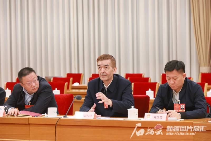 3月7日,参加十四届全国人大三次会议的新疆代表团审议全国人民代表大会和地方各级人民代表大会代表法修正草案。这是审议时阿吉艾克拜尔·艾萨代表(中)围绕推进教育对外开放深化国际学术交流和教育科研合作等内容发言。石榴云/新疆日报记者 崔志坚摄