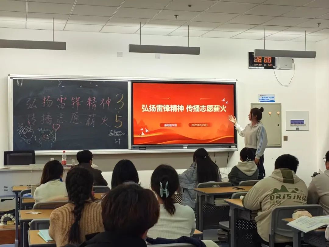基础医学院组织学生开展学雷锋主题系列教育活动,各班级通过主题班会、故事分享等形式学习领悟雷锋精神的内涵,组织朋辈互助经验分享会,邀请高年级优秀学生代表传授学习经验与成长心得,促进学风建设。同时开展社区传染病防治科普活动,提升居民的健康认知,彰显新时代医学生的使命与担当。