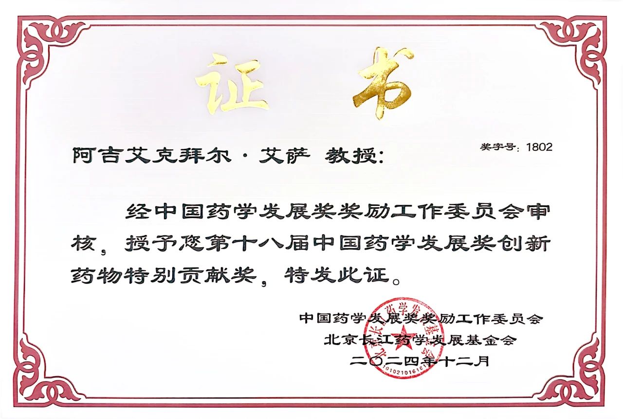 beat365在线唯一官网党委副书记、校长阿吉艾克拜尔·艾萨教授荣获第十八届中国药学发展奖·创新药物特别贡献奖。