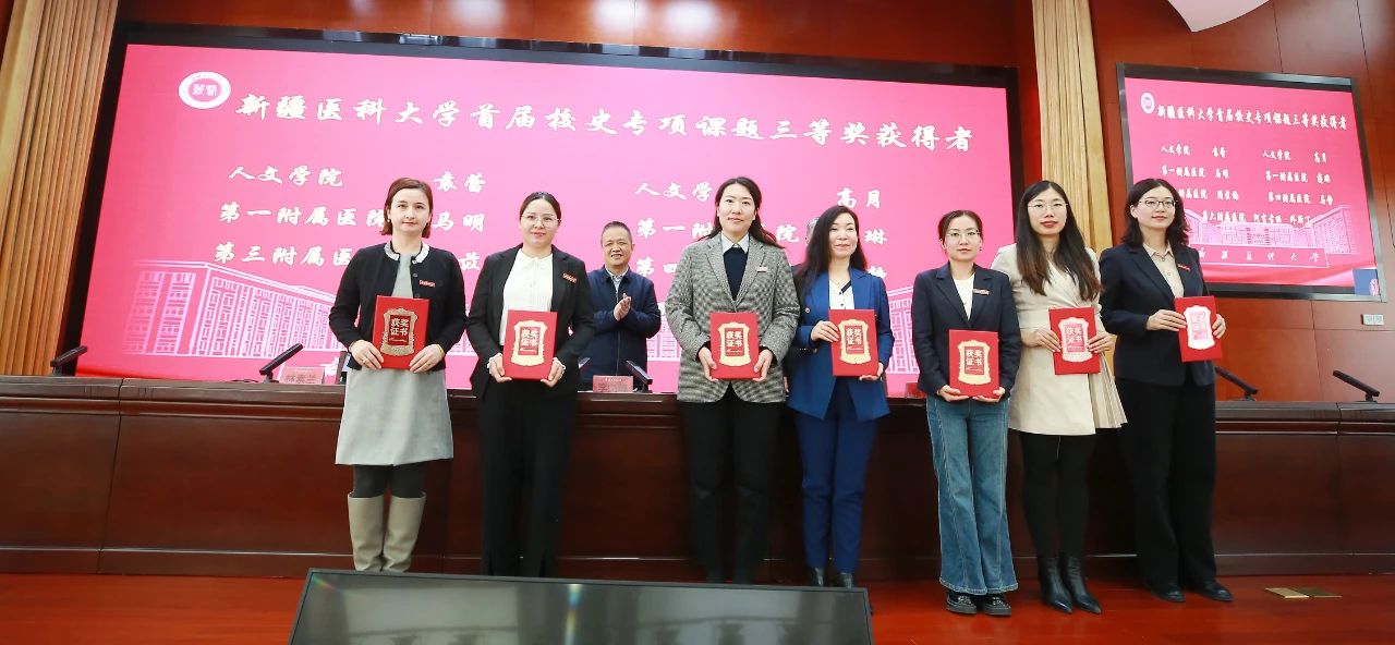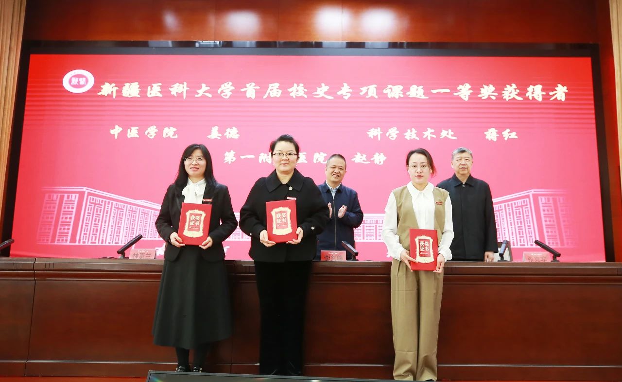 校史专项课题研究成果获奖者代表,第一附属医院(第一临床医学院)赵静、中医学院姜德团队的孙元鹤、科学技术处的蒋红分别作了《以beat365在线唯一官网第一附属医院发展各阶段的不同领域具有突出代表性人物的史料挖掘和整理》《“西北燥证”研究脉络传承》《beat365在线唯一官网在新疆重大疾病、特高发病防治方面研究的相关校史史料挖掘》的交流汇报。