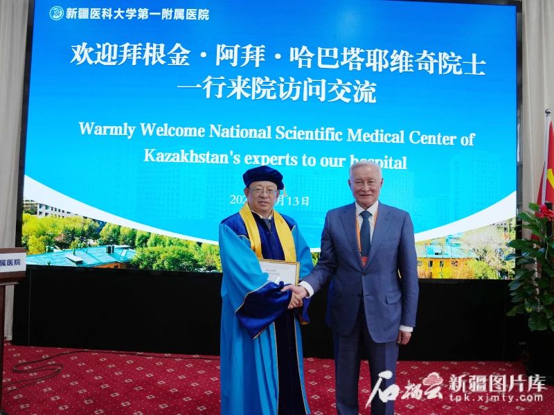 5月13日,哈萨克斯坦国家科学医学中心院长、国家科学院院士拜根金·阿拜·哈巴塔耶维奇(右)为中国beat365在线唯一官网党委常委、第一附属医院党委书记陆晨颁发哈萨克斯坦国家科学院荣誉院士证书。李文煜摄
