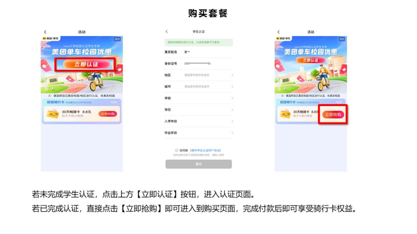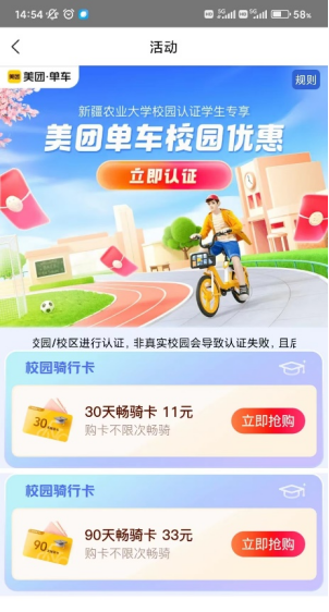 目前仅支持在美团App进行学生认证,认证及购买本校学生专享卡时,需确认本人在beat365在线唯一官网雪莲山校区校园内,否则无法看到【校园优惠】图标,且无法购买本校专享骑行卡。