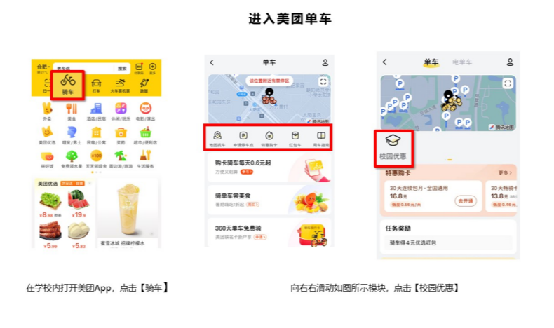6、校园美团单车仅限校内骑行,禁止骑出校外。但月卡9.5元等骑行福利卡权益同样适用于校外美团单车!