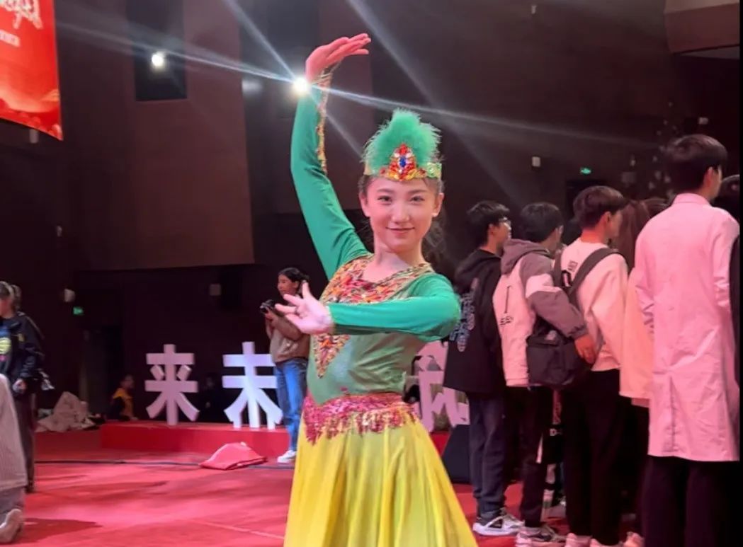 在新医加入舞蹈团的那天,好像在与小时候的自己对话。迎新晚会现场,候场时攥着裙摆的手心沁出薄汗,舞台上当追光灯打在身上,那些奔波的日子,那些咬着牙坚持的瞬间,都化作脚下自信的舞步,仿佛眼里亮着和小时候一模一样的光。