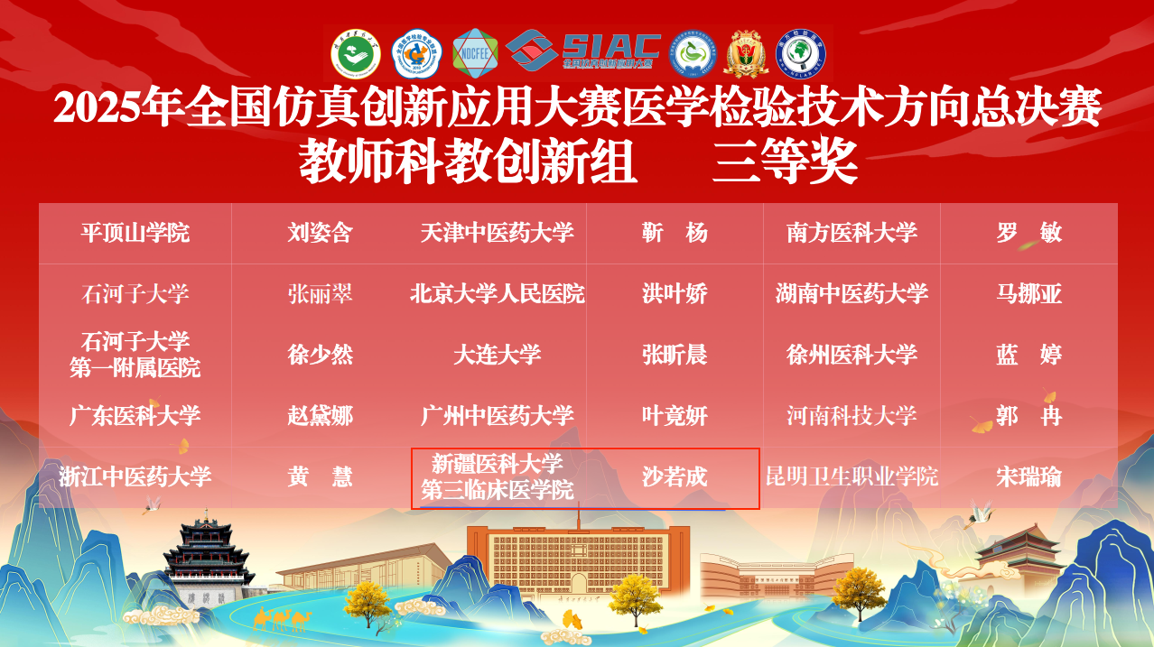 在形态学赛道中,来自第三临床医学院医学检验技术2022-1班的位然然同学和茹则古丽・艾尔肯分别荣获二等奖和三等奖。在实验诊断赛道中,第三临床医学院医学检验技术2022-1班的潘婷婷同学和徐瑞雪同学喜提二等奖、三等奖。来自第三临床医学院临床检验教研室的沙若成老师和尚晓倩老师在科教创新赛道全国总决赛中分别喜获三等奖。