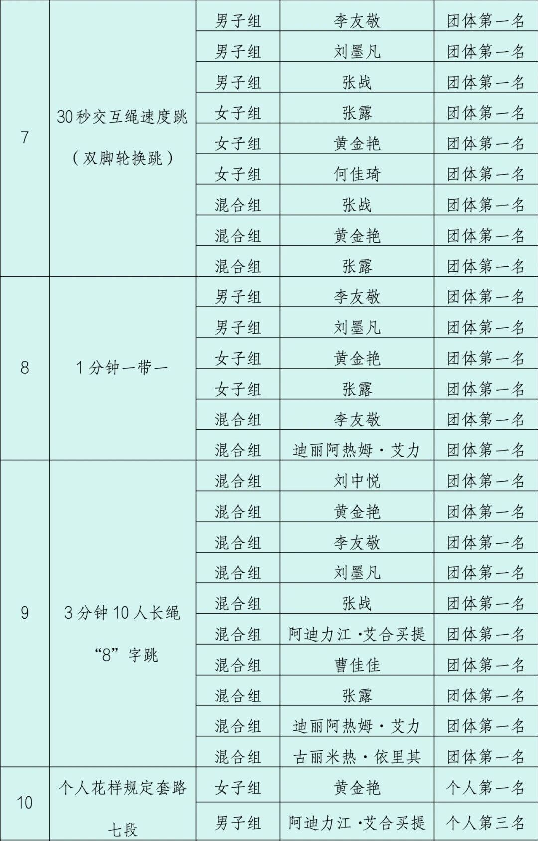据悉,本届校园跳绳联赛由自治区教育厅主办,高校组共分大学生甲、乙、丙组3个组别,涵盖速度赛、规定赛两大类共16个单项及集体项目,赛事采用“预决赛同场制”,参照全国跳绳竞赛规则评分。共有来自全疆各地州、高等学校的38支代表队、500余名运动员与教练员报名参赛,以绳会友,激情竞逐。