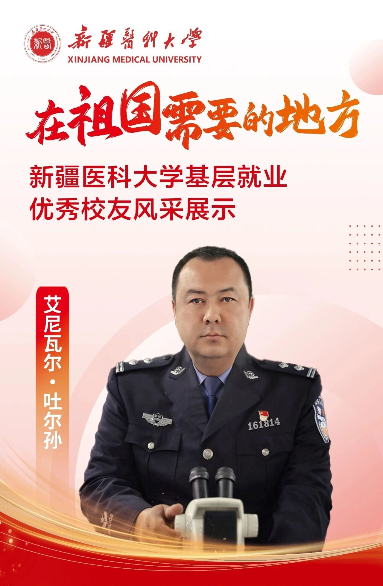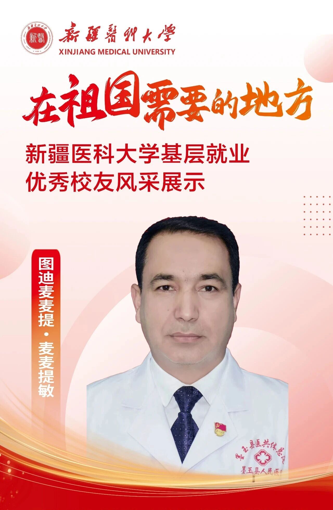 图迪麦麦提·麦麦提敏,中共党员,2003年毕业于临床医学院临床医学专业,现任墨玉县人民医院副院长。他来自一个跨越四代、薪火相传的医学世家,用仁心与坚守书写着守护边疆健康的动人故事。