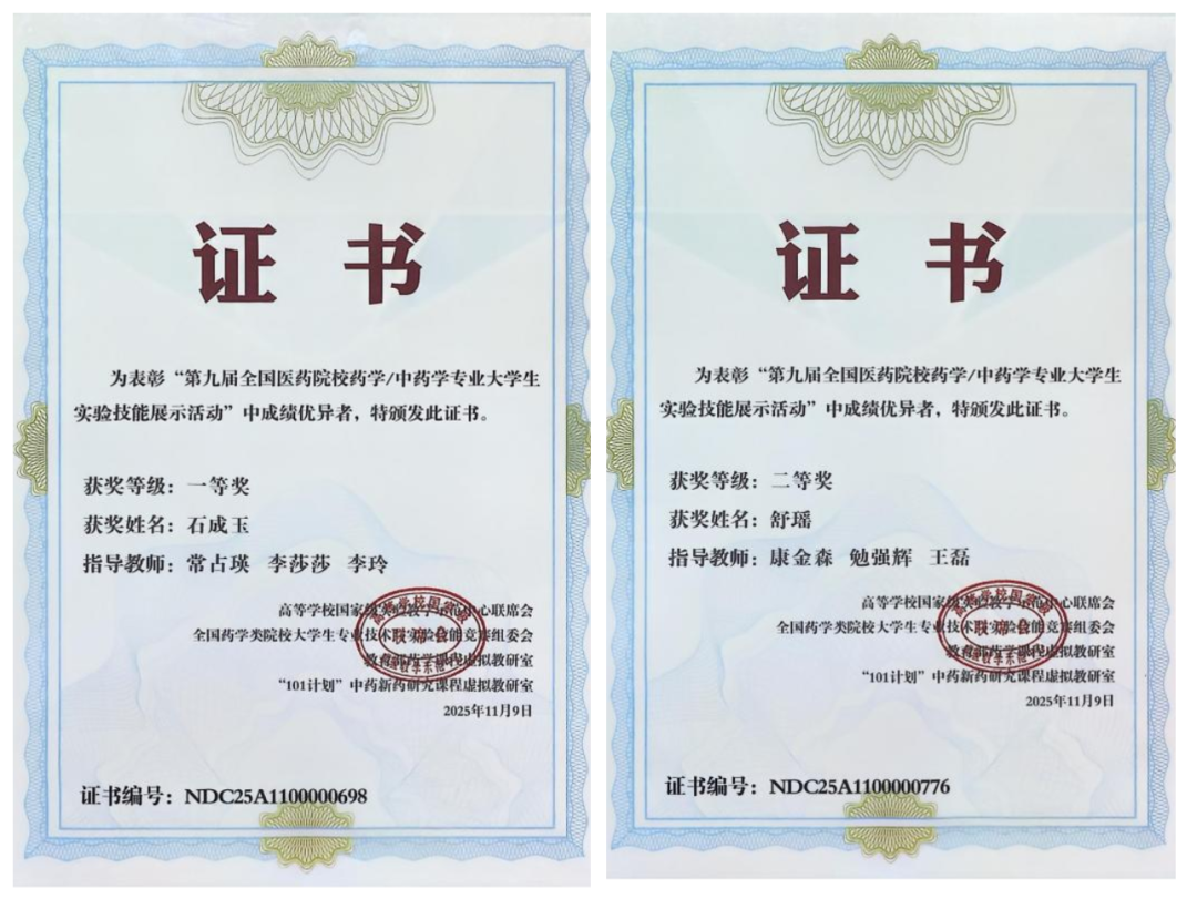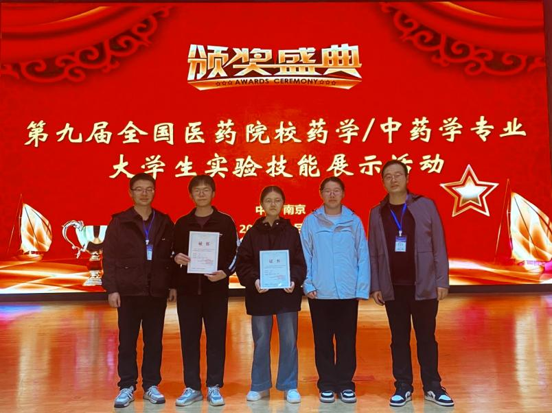 近日,在南京刚刚落幕的第九届全国医药院校药学/中药学专业大学生实验技能展示活动中,beat365在线唯一官网药学院2022级本科生石成玉(指导老师:常占瑛、李莎莎、李玲)和2022级本科生舒瑶(指导老师:康金森、勉强辉、王磊),凭借扎实的专业基础、规范的实验操作和出色的临场发挥,分别获得一等奖和二等奖。