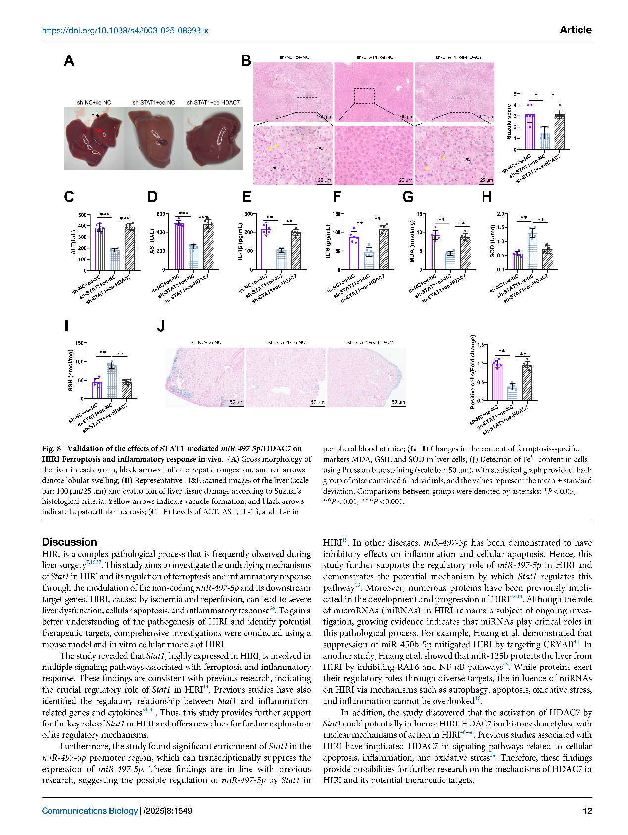 为了验证这一机制,研究人员进行了干预实验:当他们在小鼠模型中降低STAT1的表达,或提高miR-497-5p的水平时,肝损伤明显减轻;而如果人为增加HDAC7,保护效果就会消失。这说明,STAT1–miR-497-5p–HDAC7这条信号通路,确实是调控肝脏损伤的关键环节。