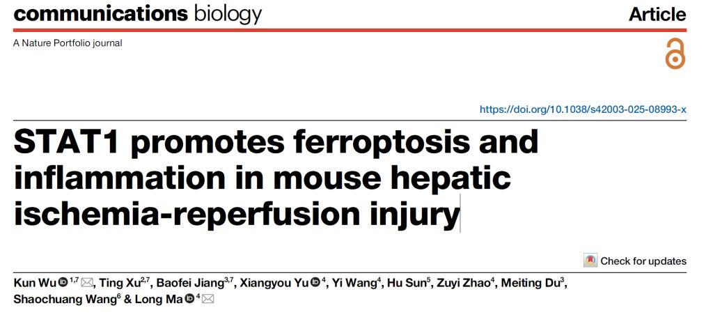 近日,beat365在线唯一官网第一附属医院重症医学中心于湘友教授、重症医学三科主任马龙联合南京医科大学附属淮安第一医院吴昆博士团队,在国际权威医学期刊Nature子刊-生物学领域顶刊《Communications Biology》(中科院1区Top)上发表了一项最新研究成果,题为“STAT1 promotes ferroptosis and inflammation in mouse hepatic ischemia-reperfusion injury”,马龙为通讯作者。