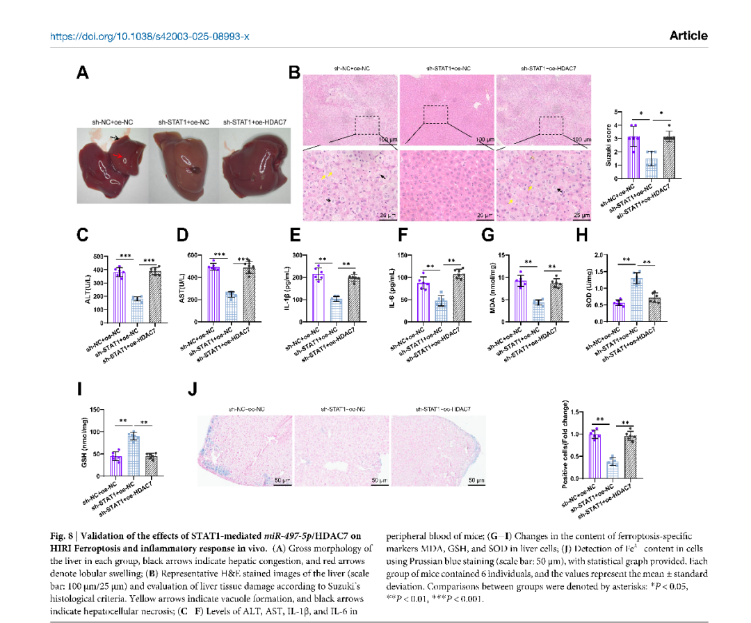 这项研究聚焦于“肝脏缺血再灌注损伤”——这是肝切除、肝移植等手术中常见且危险的并发症。简单来说,就是当肝脏在手术中暂时缺血,恢复供血后反而可能引发更严重的损伤。虽然科学家们已经知道“铁死亡”(一种铁依赖性的细胞死亡方式)在其中扮演重要角色,但具体是哪些分子在背后“操控”这一过程,仍不明确。围绕这一关键科学问题,研究团队通过分析小鼠的肝组织样本,锁定了一个关键分子——STAT1。研究团队以信号转导与转录激活因子1(STAT1)为切入点,通过转录组、蛋白组、细胞模型和小鼠模型的多层验证,深入解析STAT1于肝脏缺血再灌注损伤中的病理作用。他们发现,在肝脏缺血再灌注损伤过程中,STAT1的含量明显上升,并且会“压制”另一个名为miR-497-5p的分子。这种压制导致去乙酰化酶HDAC7活跃起来,进而推动铁死亡的发生、加剧炎症反应,最终造成肝细胞损伤。