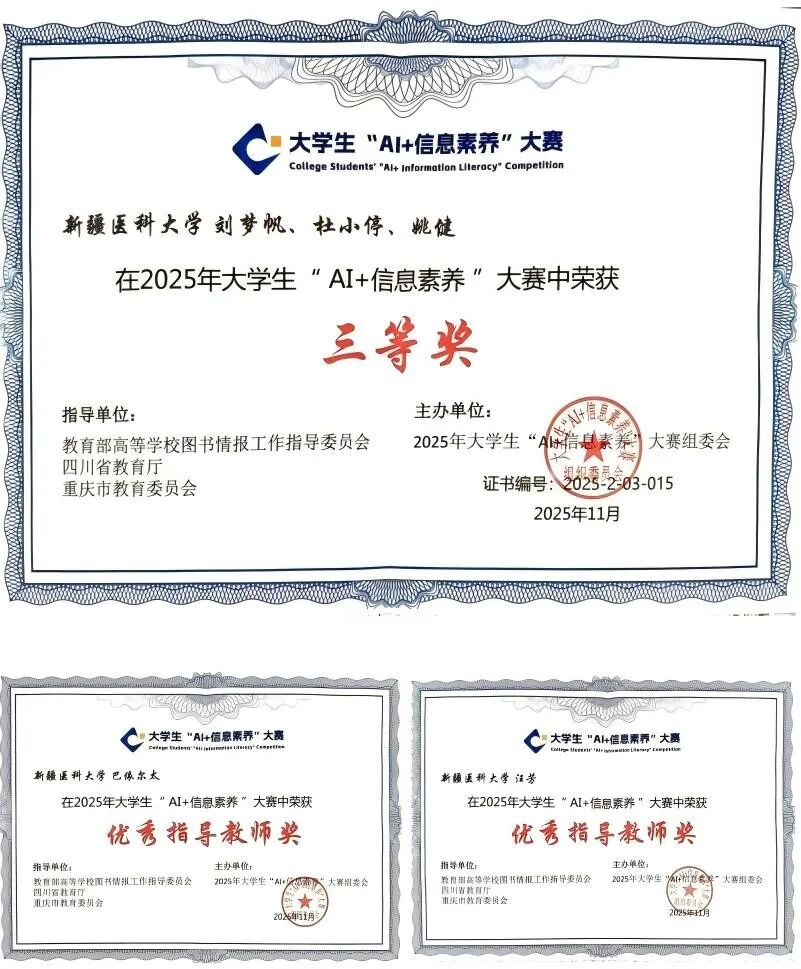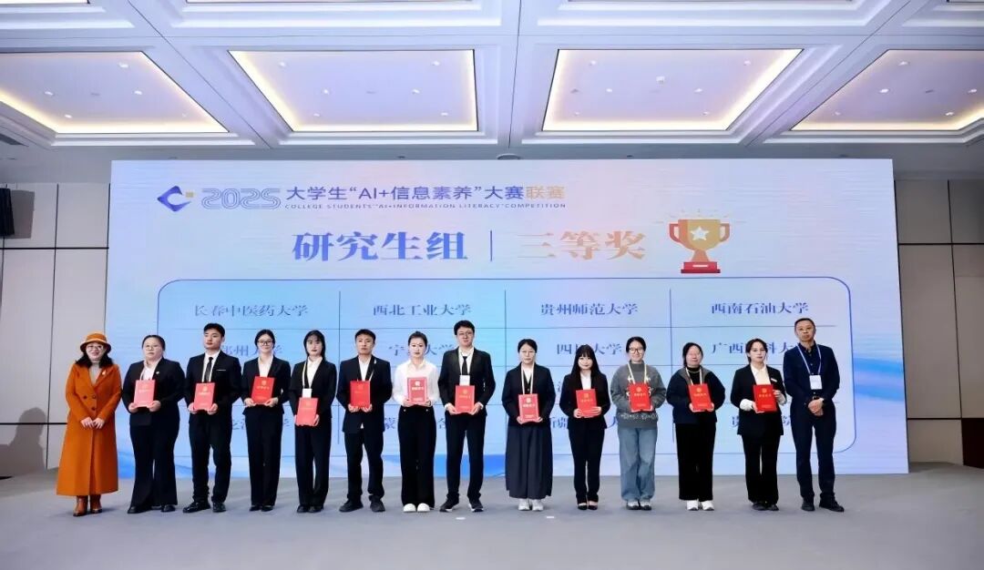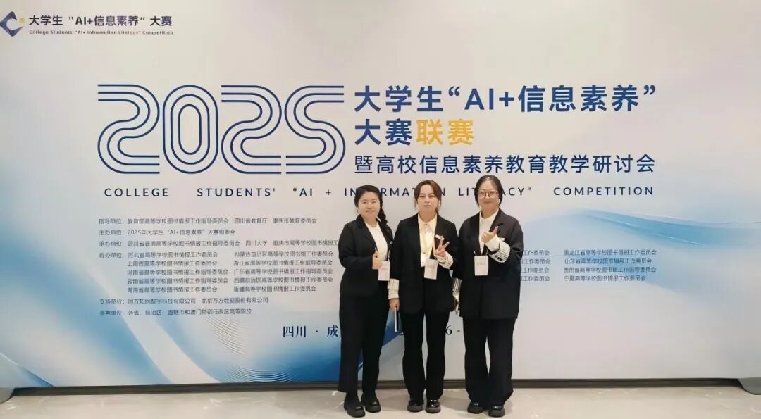 11月27日,由教育部高等学校图书情报工作指导委员会指导,四川大学主办的2025年大学生“AI+信息素养”大赛全国联赛在四川大学圆满落幕。beat365在线唯一官网刘梦帆、杜小停、姚健三位研究生组成的代表队,在汪芳、巴依尔太老师的悉心指导下,荣获全国三等奖!