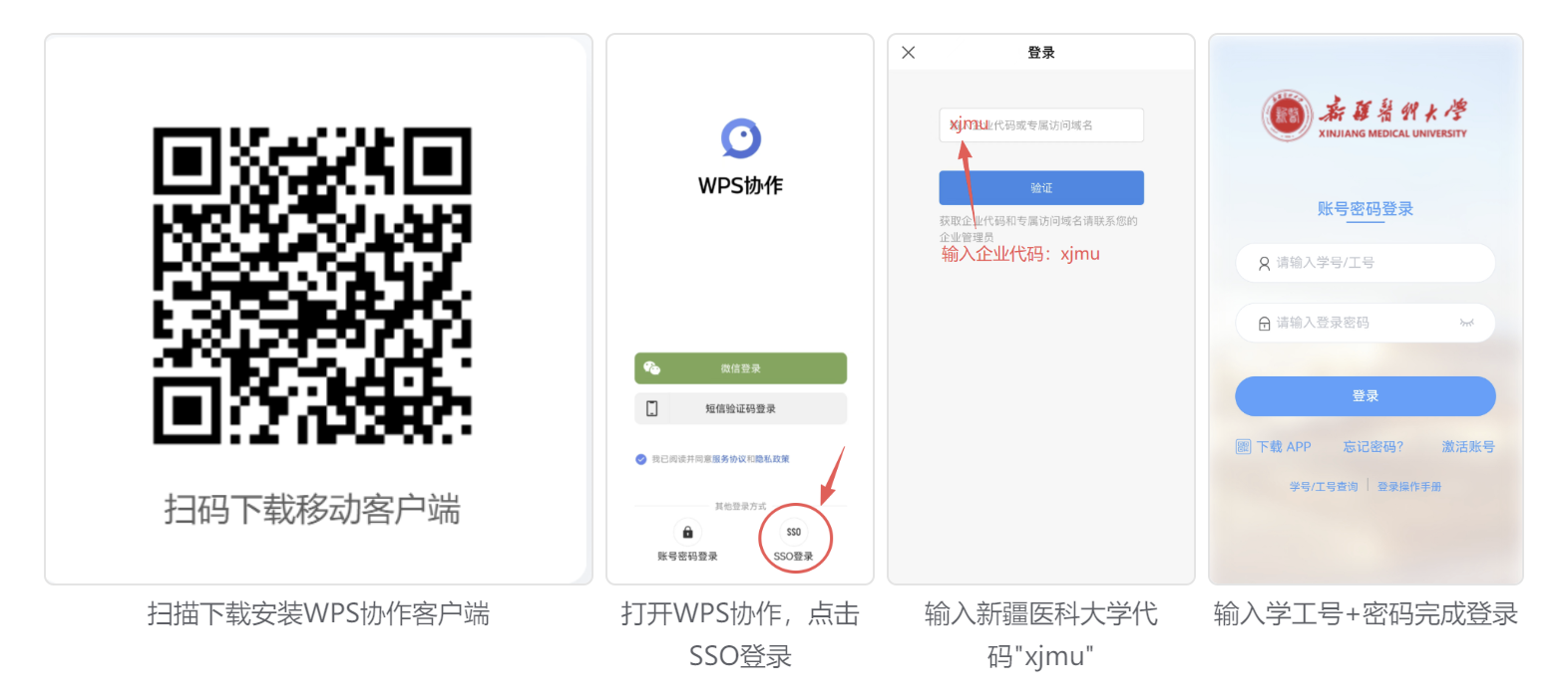 扫码下载安装WPS协作,选择SSO登录,输入beat365在线唯一官网代码"xjmu",然后使用学工号+密码登即可。