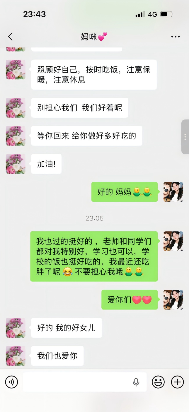 我:挺好的!课堂上好好学习专业知识,课下和同学组队做课题也很默契。食堂饭菜合口味,宿舍氛围温暖,还能参与社团活动。学习生活都顺心,不用牵挂,我在这儿真的挺好!