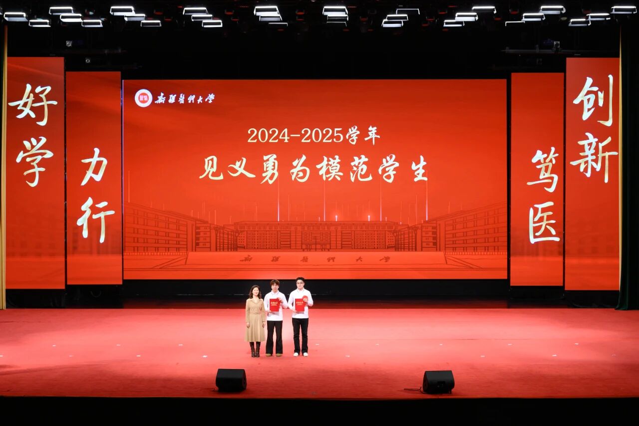 会上,对在10月底运用专业知识成功救治一名气道梗阻儿童的中医学院禹海龙、邱禹博两位同学,被授予“见义勇为模范学生”荣誉称号。