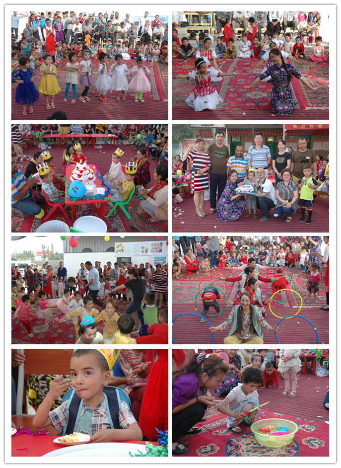 嘴角流露出略带紧张和惊讶的微笑。直到收到礼物时,眼睛才笑成了一小轮弯月。“祝你生日快乐,祝你生日快乐,祝你生日快乐,祝你生日快乐!”全场的孩子们和工作队员们一起唱起了生日快乐歌。穆海麦提的妈妈在自己的孩子身后悄悄拭去了眼角的泪水,照全家福的时候,她握住工作队王边疆队长的手说“谢谢,谢谢你们,为孩子准备的这个活动,我的孩子没过个这样的生日,今天看到他这么开心,我也特别的高兴,真是太谢谢你们了!”幼儿园的每一个孩子都分享了小寿星们的生日蛋糕,看着被舔干净的餐盘,家长们都抚掌大笑。