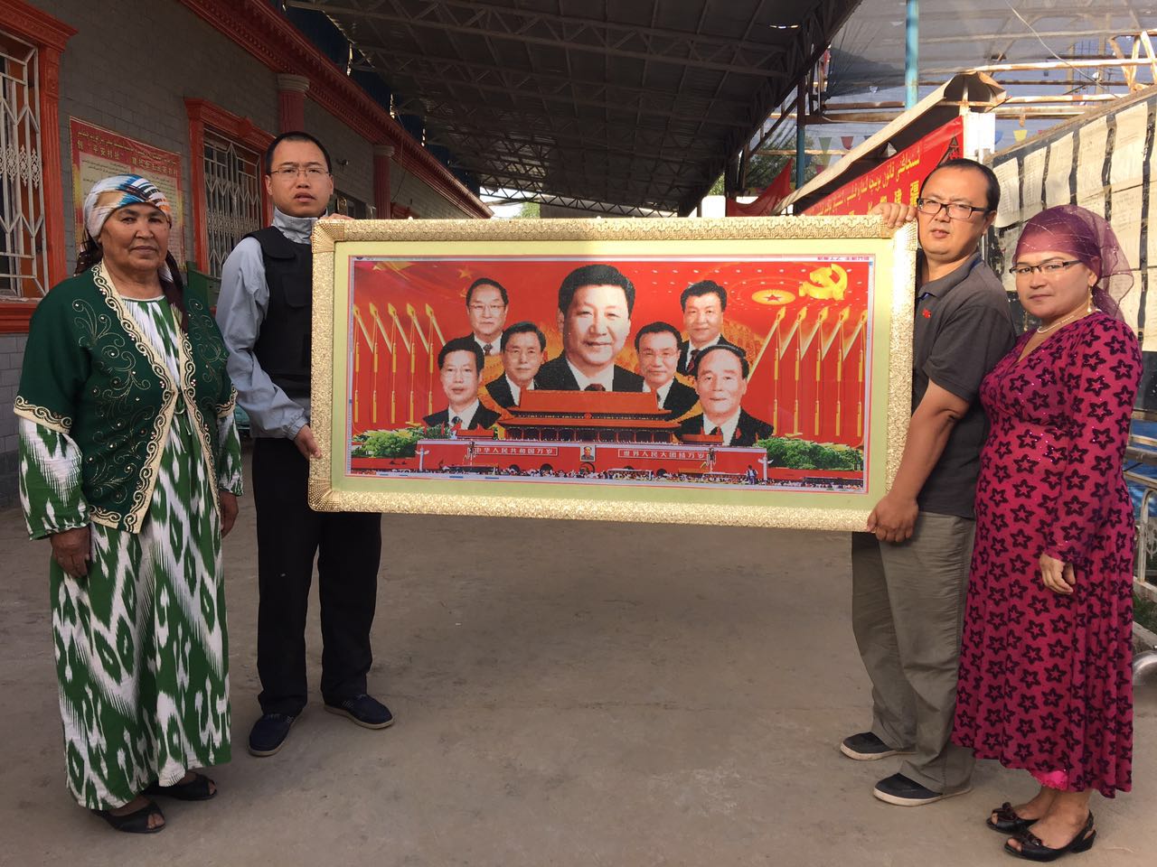 6月12日,在升国旗仪式上,和田地区墨玉县托格拉克麻扎村乡的村民汗妮萨·萨依木将自己精心绣制的领导人画像和天安门绣匾送给了beat365在线唯一官网“访惠聚”驻村工作队。这幅饱含深情厚意的绣匾是村民们对驻村工作队员们工作的一种认可,更是广大基层群众发自内心表达对中国共产党、对习近平总书记的感恩之情。