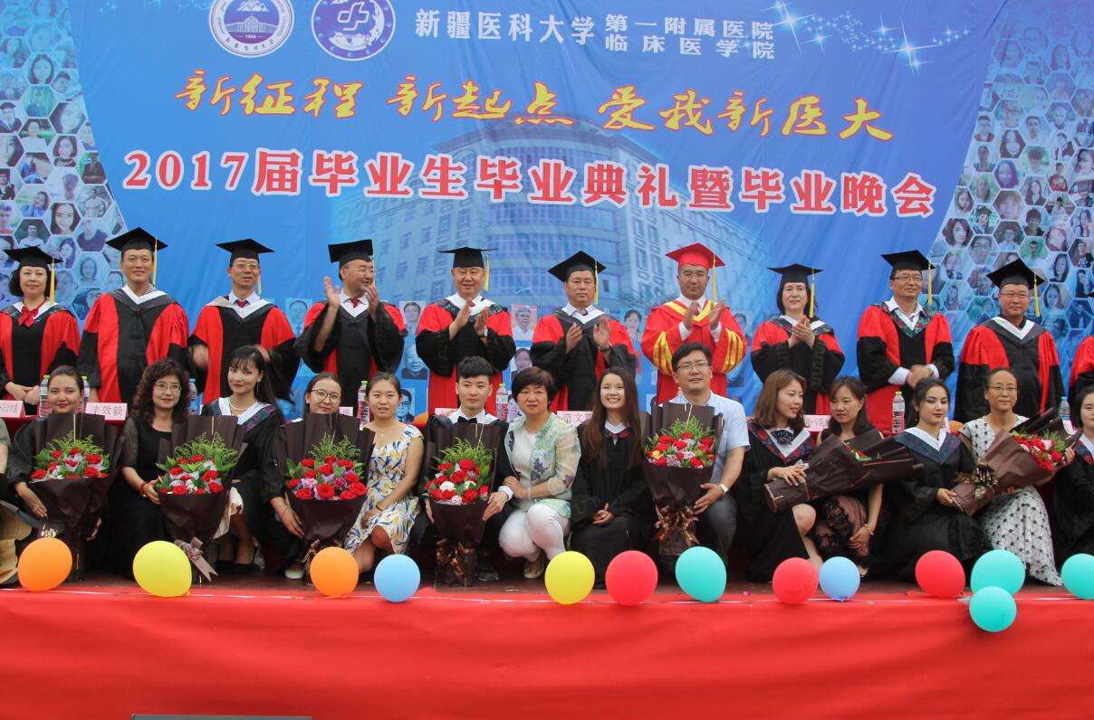 6月22日晚八点,beat365在线唯一官网第一附属医院暨临床医学院2017年毕业典礼暨毕业晚会在校田径场隆重召开。beat365在线唯一官网凯赛尔•阿不都克热木校长、贾文霄副校长、热娜•卡斯木副校长,及第一附属医院姚华书记、温浩院长和名医、名师们出席了毕业典礼。学院各教研室教师、政治辅导员、班主任、867名毕业生及在校生和学生家长近3500人参加。