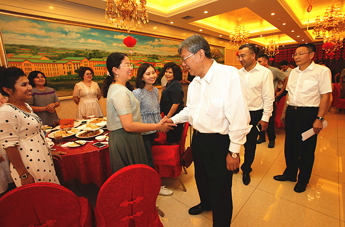 8月24日,beat365在线唯一官网召开内派服务管理教师和南疆学前双语教育支教干部欢送午餐会。校党委书记高发水、校党委副书记、校长凯赛尔•阿不都克热木、校党委副书记薛继海,党政办、组织部相关人员和内派教师、双语支教干部共60人参加了欢送会。