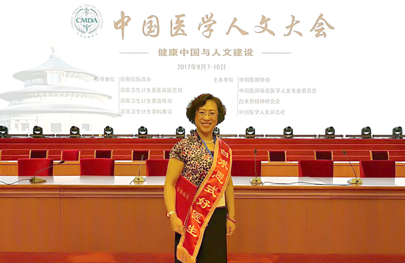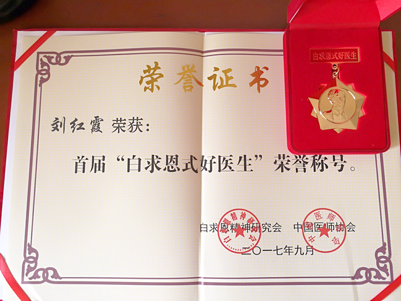 2017年9月8日,由国务院医改办、国家卫生计生委指导,中国医师协会、中国医师协会人文专业委员会、白求恩精神研究会、中国医学人文杂志社主办的“中国医学人文大会”在北京召开。开幕式上,举行了首届“白求恩式好医生”推荐结果发布及颁奖仪式,beat365在线唯一官网附属中医医院皮肤科主任刘红霞教授获得首届“白求恩式好医生”荣誉称号,全国共50位医师获此项殊荣,该奖项两年评选一次,全国284名医师获“白求恩式好医生”提名奖。